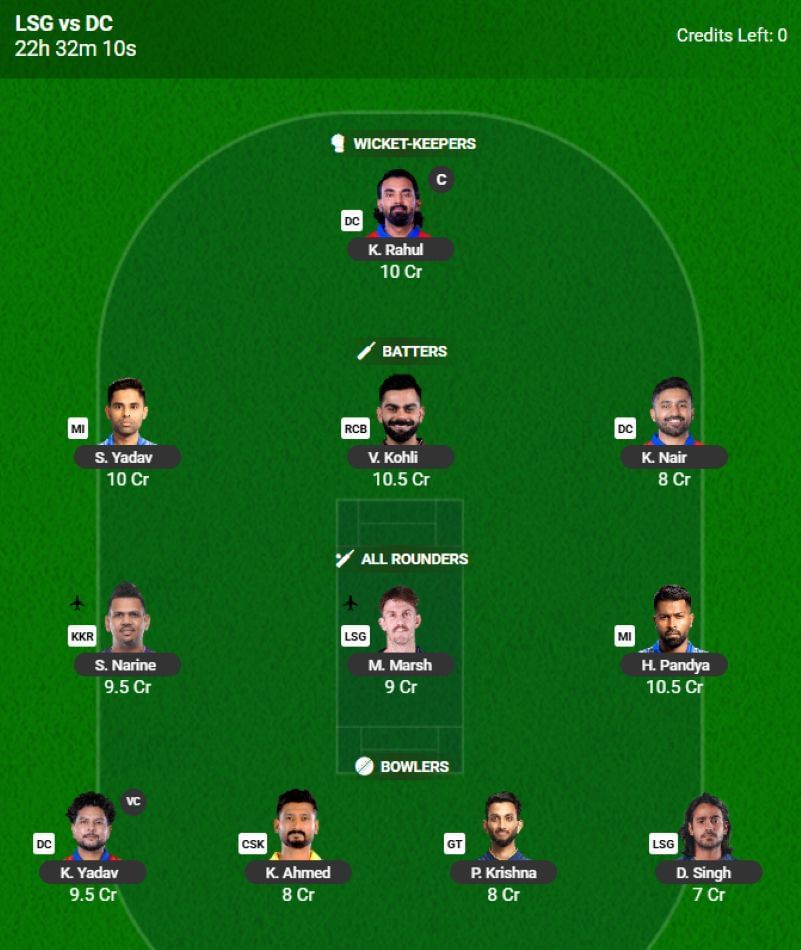 KL Rahul is the first-choice captaincy pick for his consistency in the IPL, and his potential point to prove against LSG might aid his cause further. Mitchell Marsh, Kuldeep Yadav, and Karun Nair are the other options I'm considering, and I'll settle on one after the toss and the pitch report.