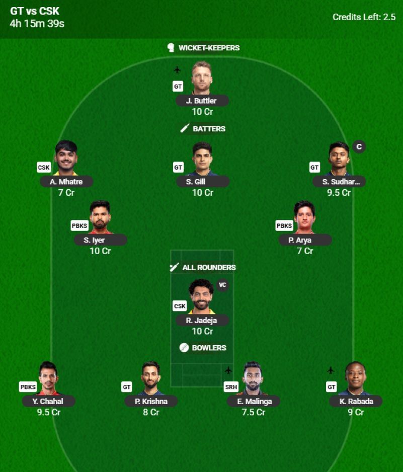 Players playing in Match 67: Ayush Mhatre (CSK) (BAT) (7 Credits), Shubman Gill (GT) (BAT) (10 Credits), Sai Sudharsan (GT) (BAT) (9.5 Credits), Jos Buttler (GT) (WK) (10 Credits), Ravindra Jadeja (CSK) (ALL) (10 Credits), Prasidh Krishna (GT) (BOWL) (8 Credits), and Kagiso Rabada (GT) (BOWL) (9 Credits).