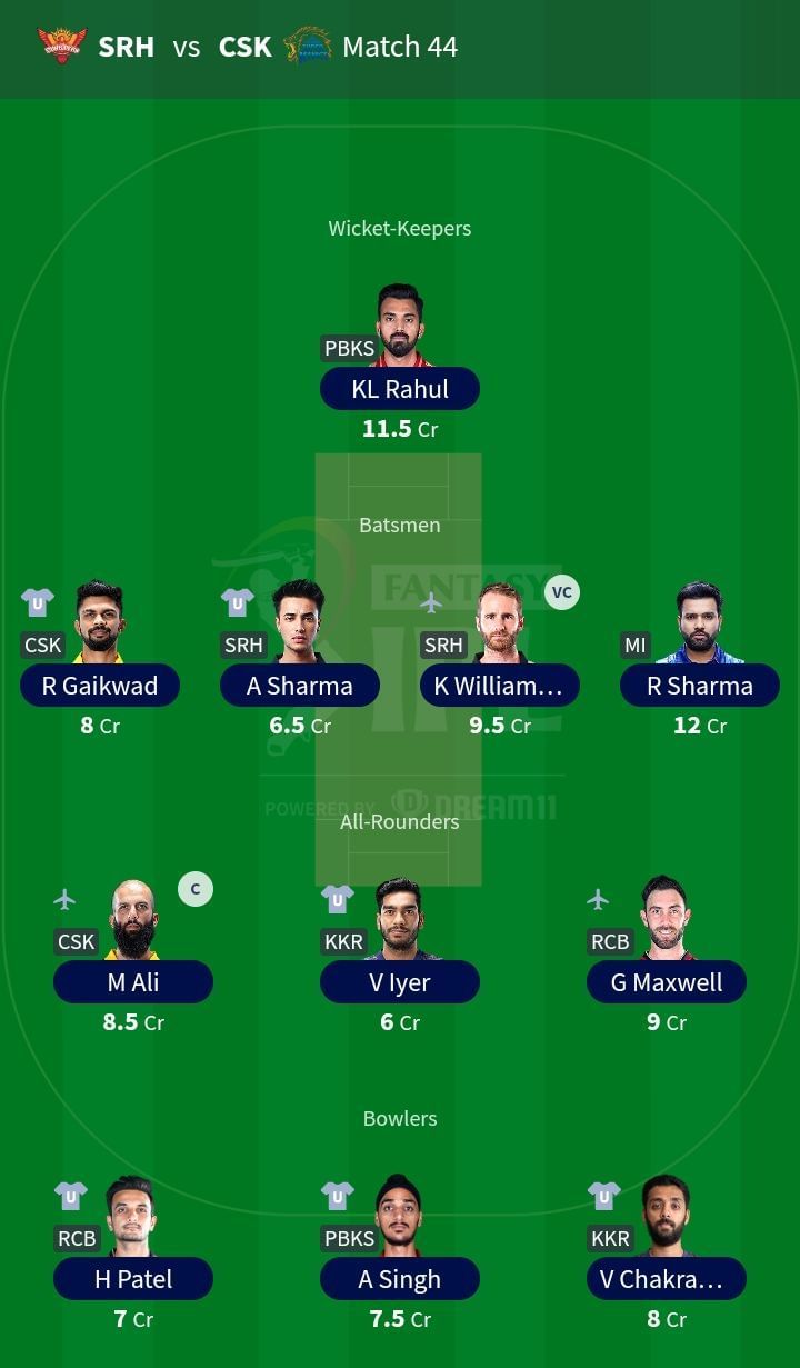 Players playing in Match 44: Kane Williamson (BAT) (SRH) (9.5 Credits), Abhishek Sharma (BAT) (SRH) (6.5 Credits), Ruturaj Gaikwad (BAT) (CSK) (8 Credits), and Moeen Ali (ALL) (CSK) (8.5 Credits).