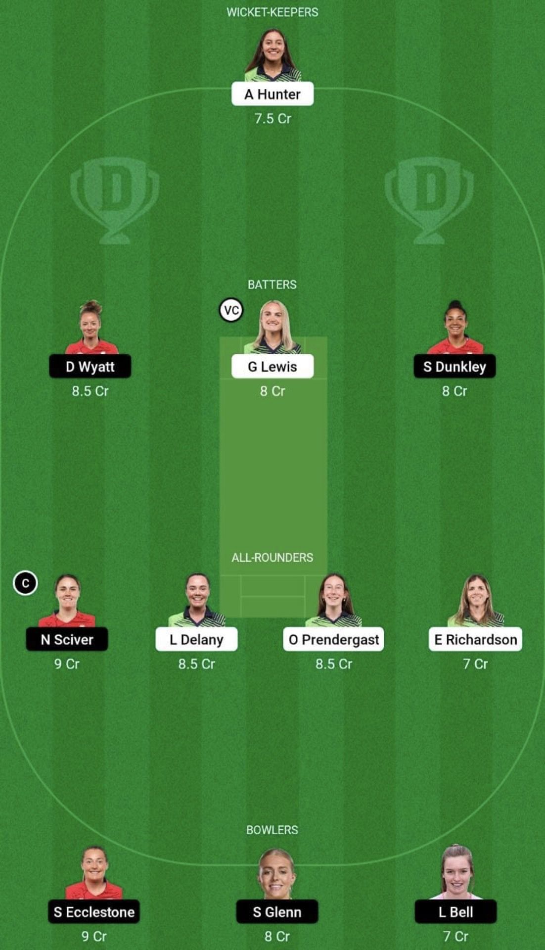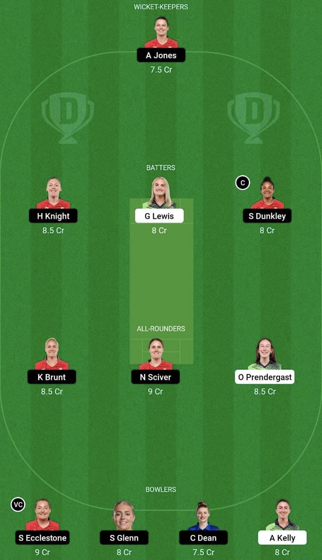 Sophia Dunkley, Danielle Wyatt, Alice Capsey, Natalie Sciver, Heather Knight (c), Amy Jones (wk), Katherine Brunt, Sophie Ecclestone, Charlotte Dean, Sarah Glenn and Kate Cross/Lauren Bell.