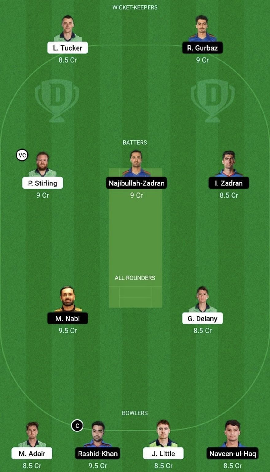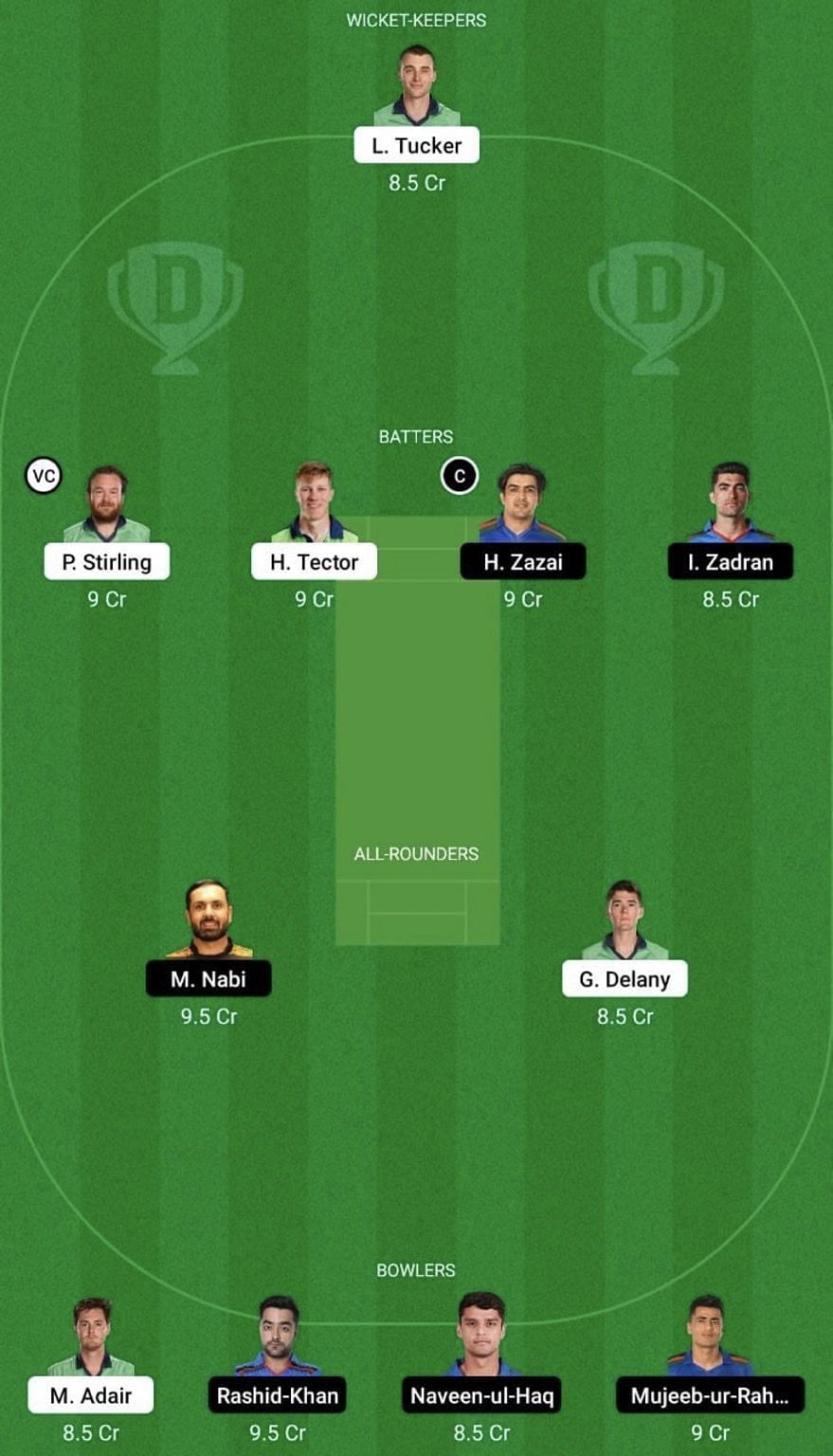 Fantasy Suggestion #1: Lorcan Tucker, Rahmanullah Gurbaz, Ibrahim Zadran, Najibullah Zadran, Paul Stirling, Mohammad Nabi, Gareth Delany, Mark Adair, Rashid Khan, Josh Little and Naveen-ul-Haq.