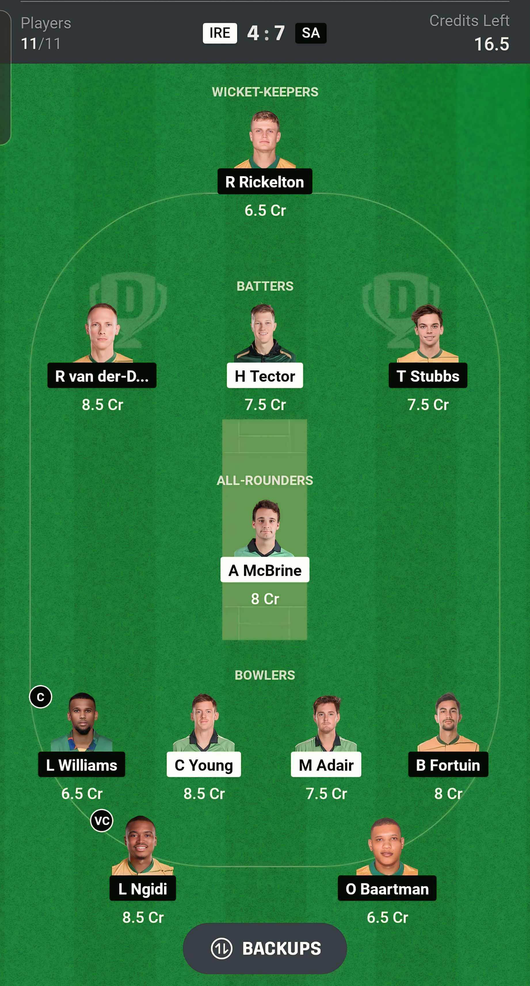 Lizaad Wlllaims is another crucial pick from the South Africa squad. He will complete his quota of overs. He can take a lot of wickets in the death overs like he did in the last match. He picked up four wickets and bowled a maiden over in the last match.