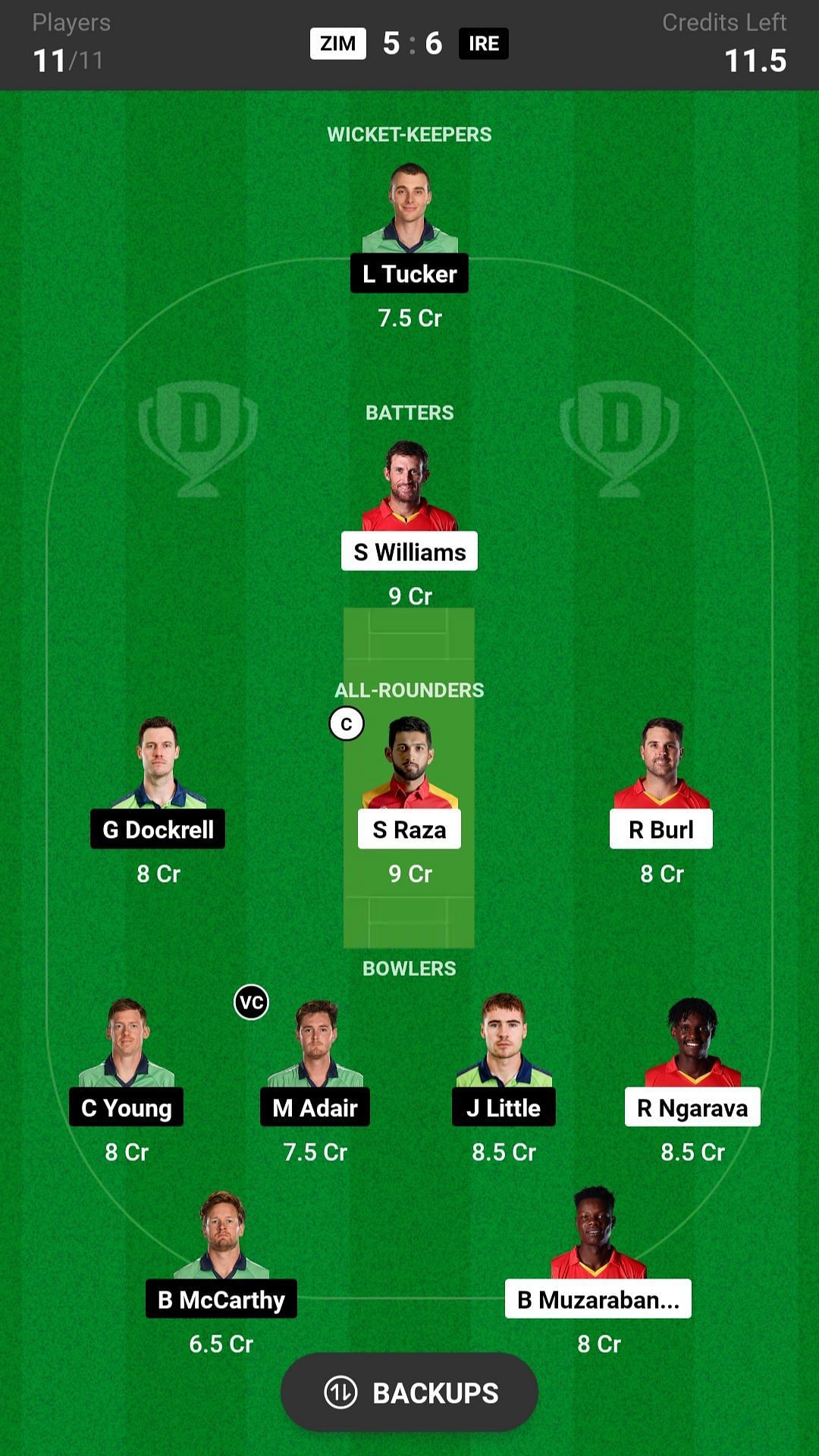 R Burl and S Raza are the best all-rounder picks for the Dream11 team as they are batting in the middle order and also completing their quota of overs. G Dockrell is another good pick for today's match.