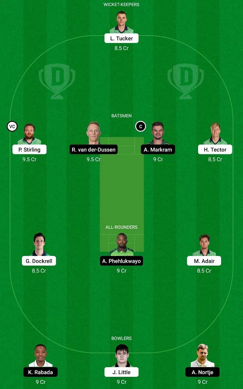 Fantasy Suggestion #1: Lorcan Tucker, Paul Stirling, Rassie van der Dussen, Aiden Markram, Harry Tector, George Dockrell, Andile Phehlukwayo, Mark Adair, Kagiso Rabada, Josh Little and Anrich Nortje