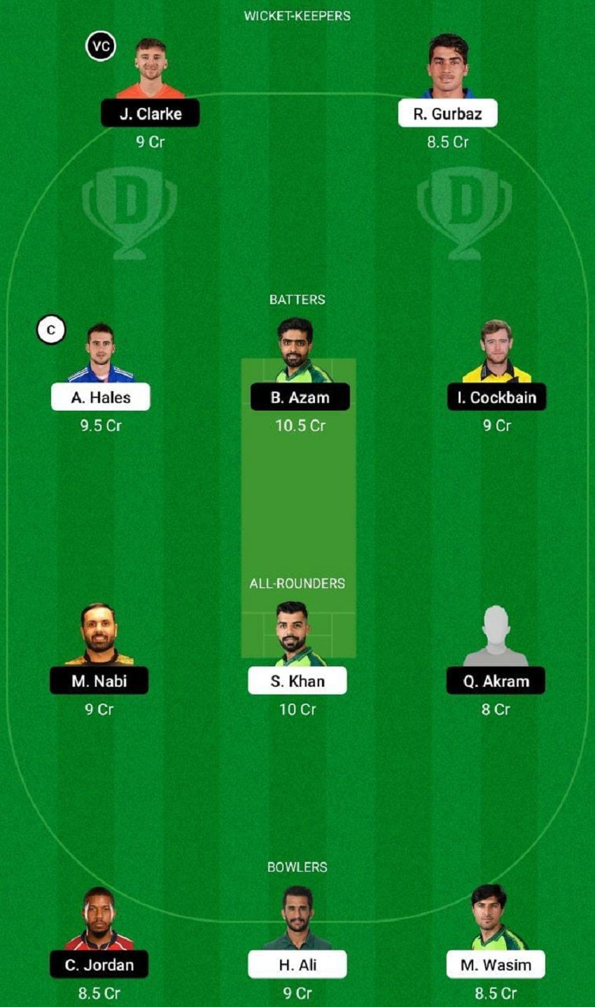 Fantasy Suggestion #1: Joe Clarke, Rahmanullah Gurbaz, Alex Hales, Babar Azam, Ian Cockbain, Mohammad Nabi, Shadab Khan, Qasim Akram, Chris Jordan, Hasan Ali and Mohd Wasim Jr