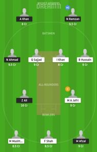 Fantasy Suggestion #1: A Khan, N Ramzan, N Ahmad, Q Sajjad, I Khan, B Hussain, Z Ali, M A Jafri, M Mushtaq, M Afzal, F Shah