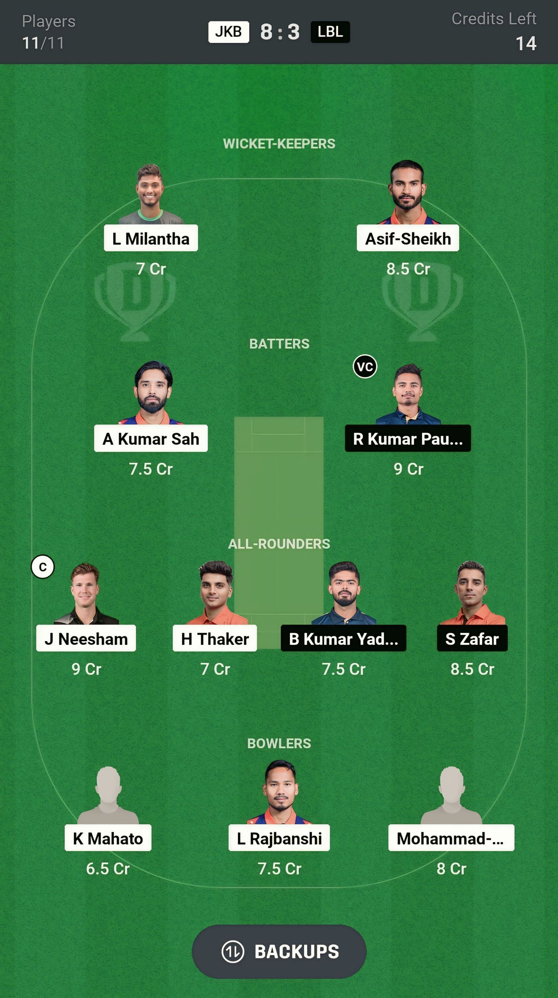 LBL vs JKB match captain and vice-captain choices