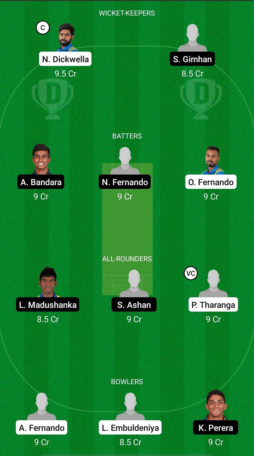 Captain: Niroshan Dickwella. Vice-captain: Pulina Tharanga.