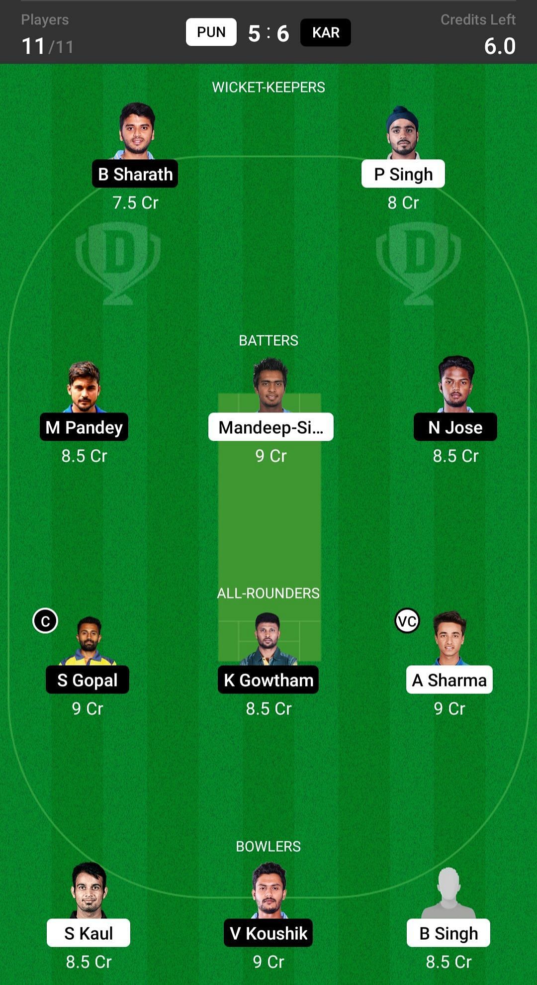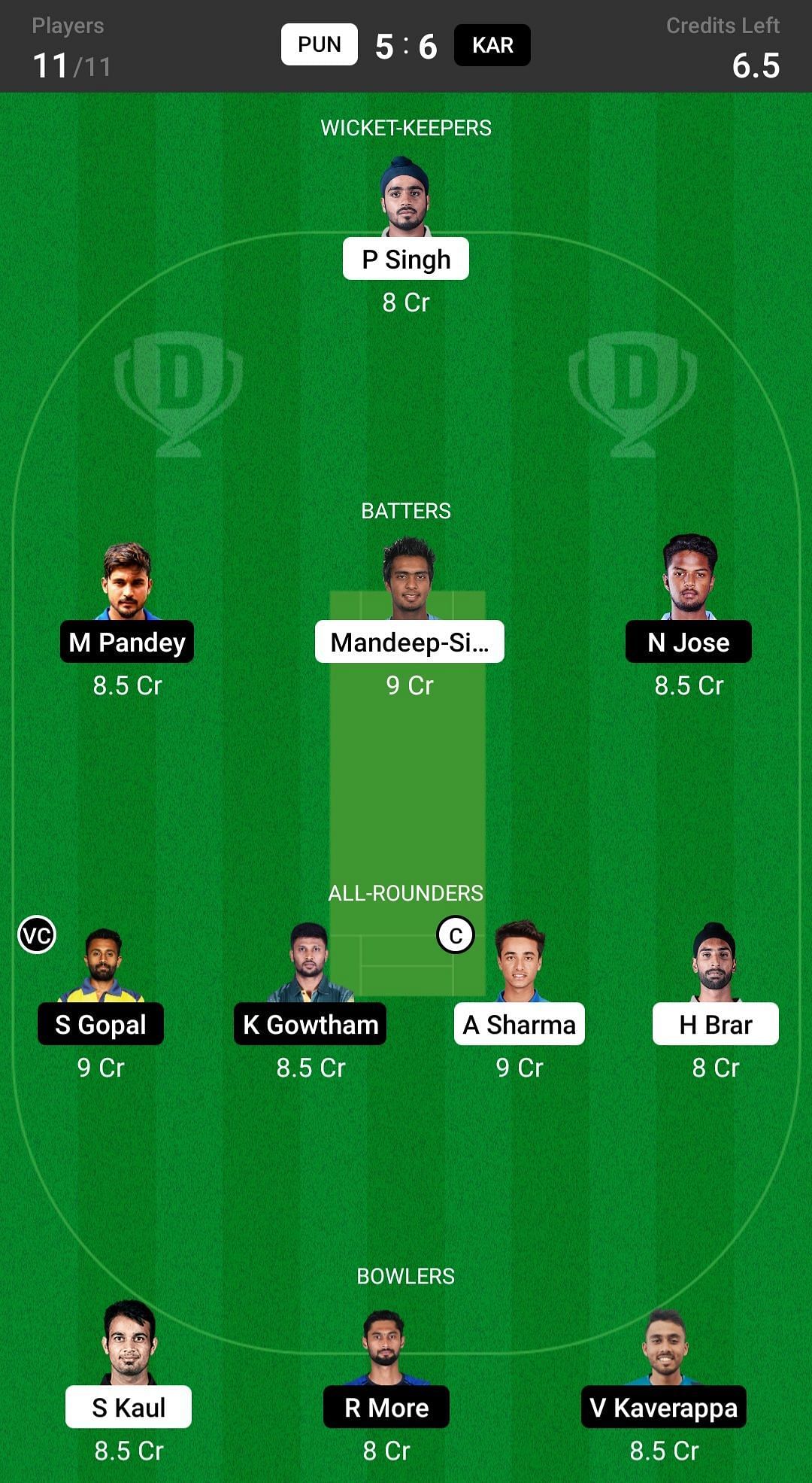 Karnataka vs Punjab Dream11 Prediction Today, Grand League