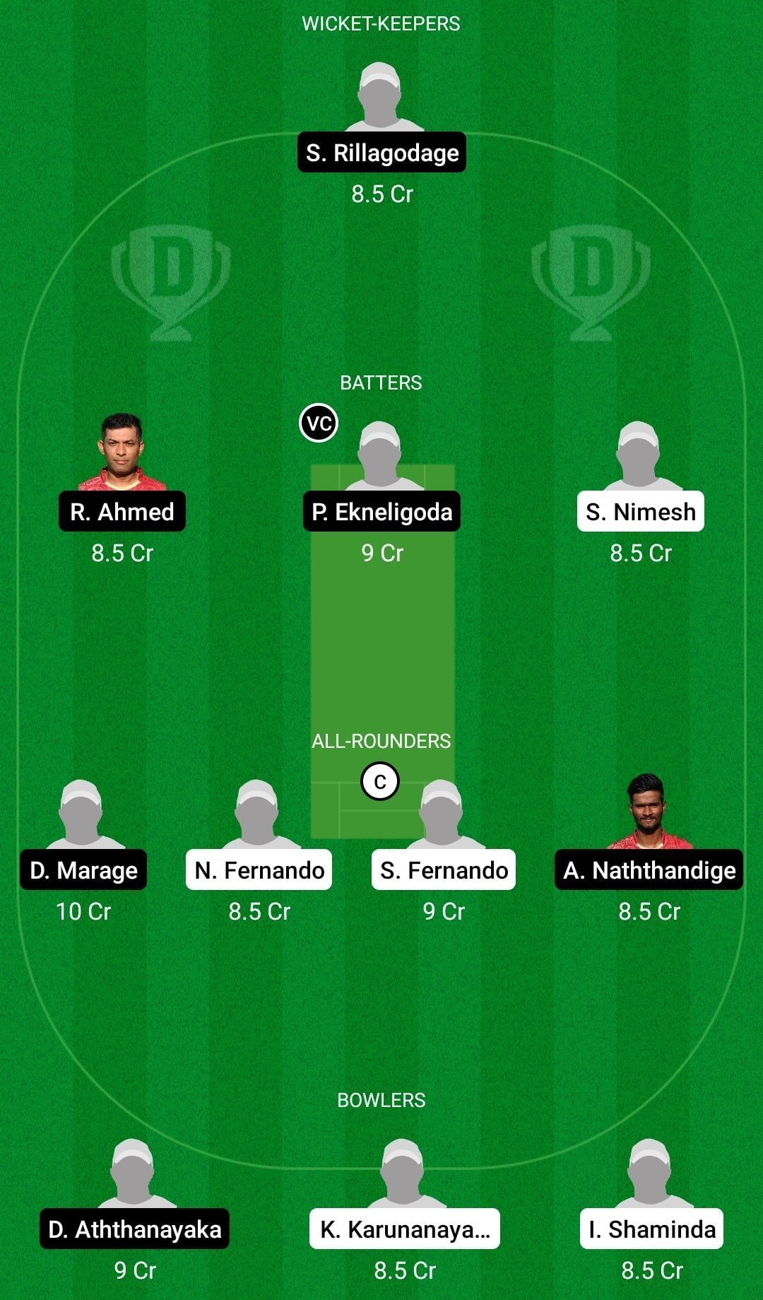 Fantasy Suggestion #1: Sujith Rillagodage, Rahat Ahmed, Prabath Ekneligoda, Samaru Nimesh, Dinidu Marage, Nicolo Fernando, Sajith Fernando, Achintha Naththandige, Dammika Aththanayaka, Kavinda Karunanayaka, Ishan Shaminda.