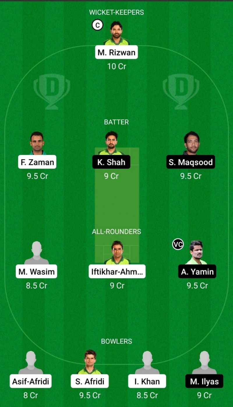 Mohammad Rizwan (C/WK), Fakhar Zaman, Sahilbzada Farhan, Musadiq Ahmed, Iftikhar Ahmed, Mohammad Wasim, Adil Amin, Shaheen Afridi, Arshad Iqbal, Imran Khan, Asif-Afridi.