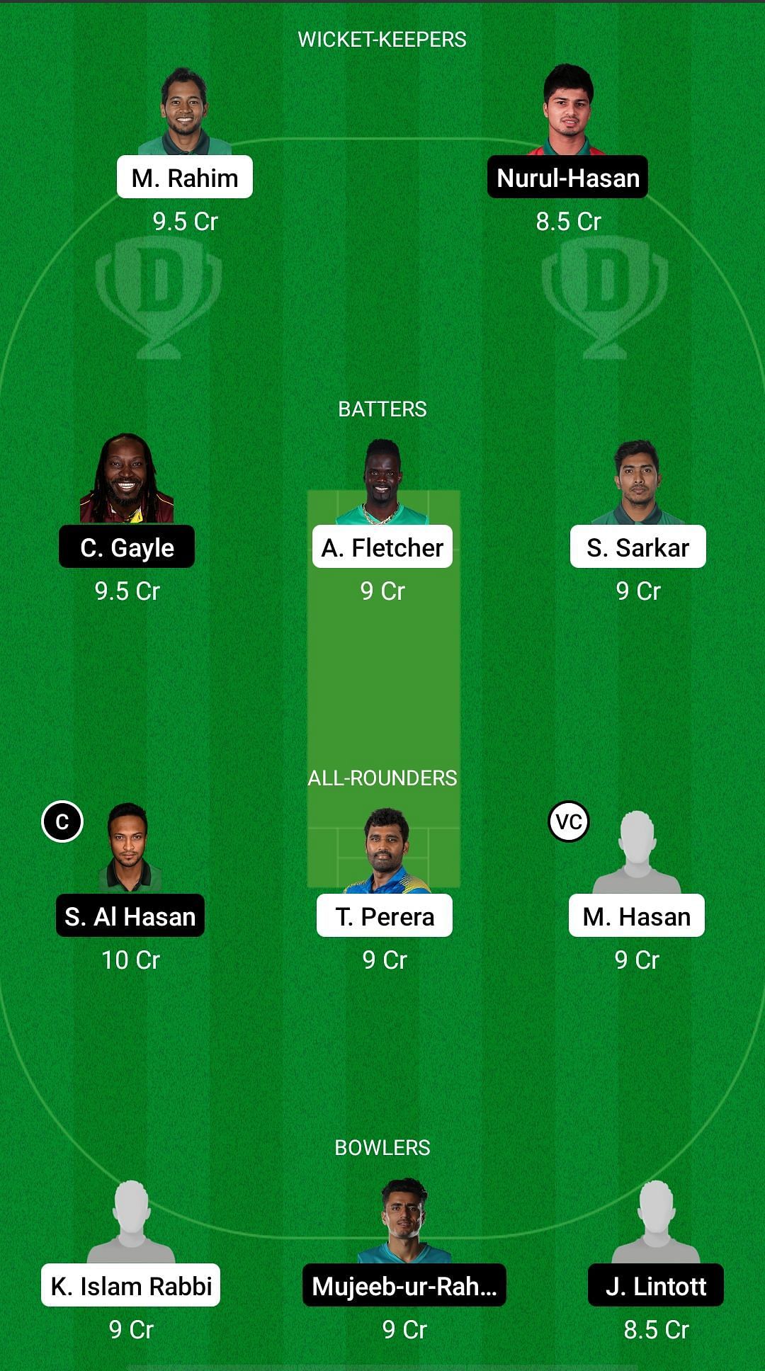 Fantasy Suggestion #1: Mushfiqur Rahim, Nurul Hasan, Chris Gayle, Andre Fletcher, Soumya Sarkar, Shakib Al Hasan, Thisara Perera, Mahedi Hasan, Kamrul Islam, Mujeeb Ur Rahman, Jake Lintott.