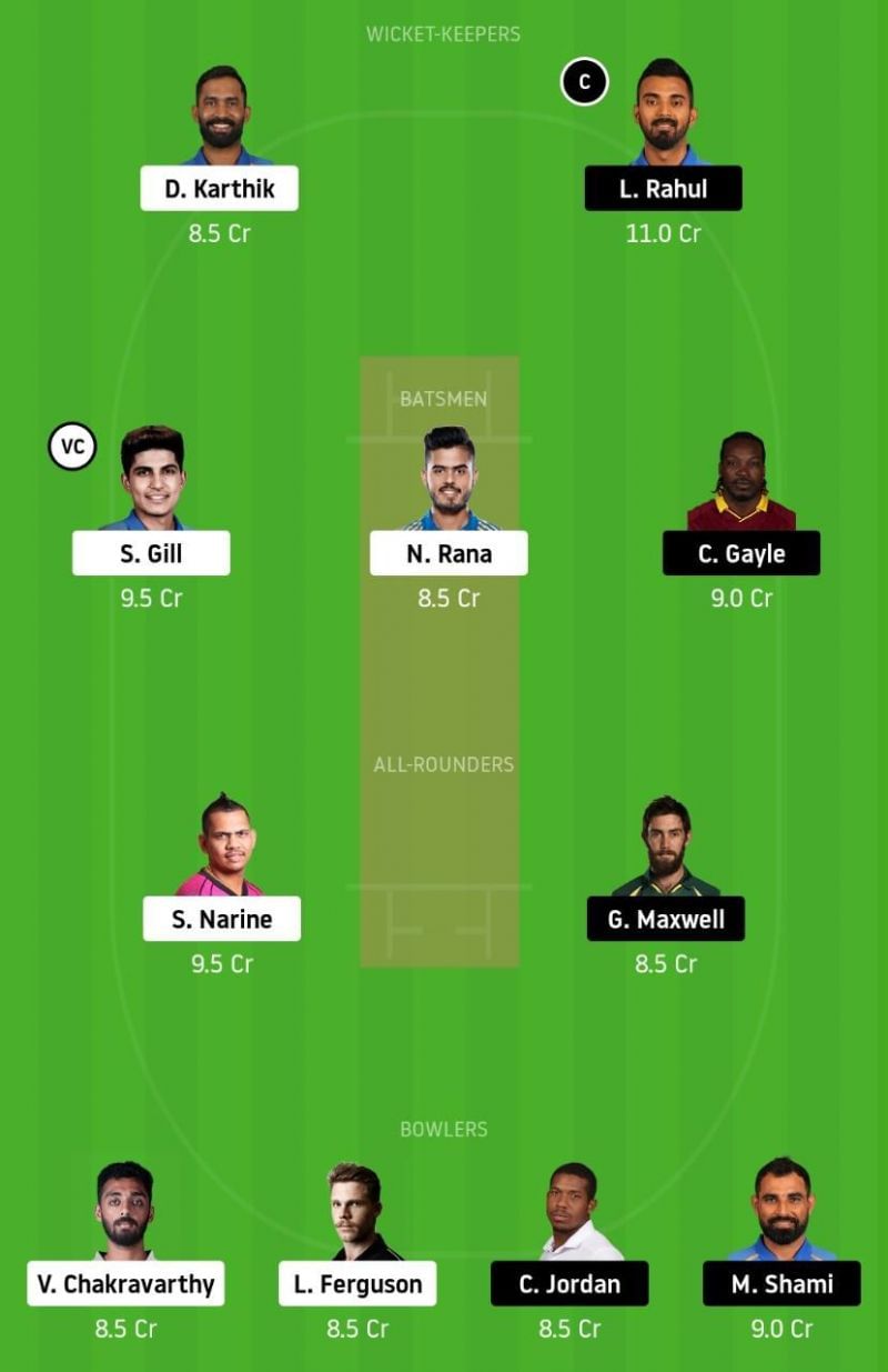 Fantasy Suggestion #1: KL Rahul, Dinesh Karthik, Shubman Gill, Nitish Rana, Chris Gayle, Sunil Narine, Glenn Maxwell, Mohammed Shami, Chris Jordan, Varun Chakravarthy and Lockie Ferguson