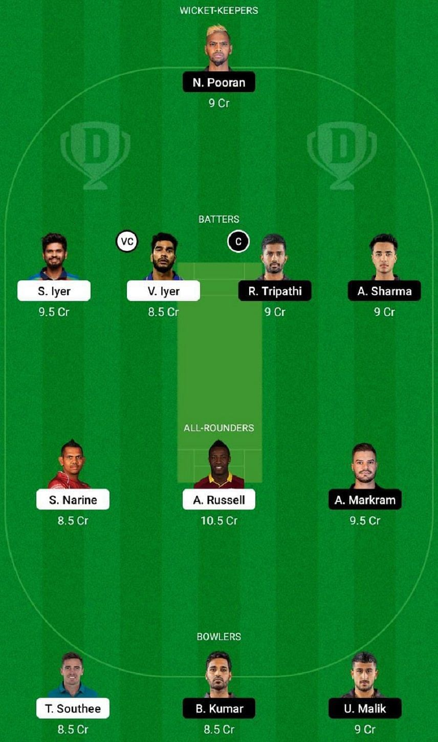 Fantasy Suggestion #2: Nicholas Pooran, Abhishek Sharma, Shreyas Iyer, Venkatesh Iyer, Rahul Tripathi, Sunil Narine, Andre Russell, Aiden Markram, Bhuvneshwar Kumar, Tim Southee and Umran Malik.