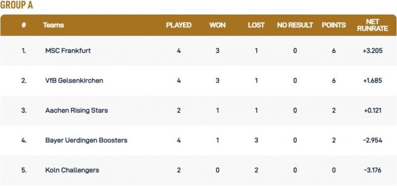 Aachen Rising Stars and Bayer Uerdingen Boosters, who have a couple of points each, follow the two table-toppers in the Group A standings. The former have a superior net run rate and have played a couple of matches fewer.