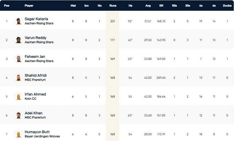 The Bayer Uerdingen Wolves quartet of Humayun Butt (168), Waqas Fatmi (104), Muhammad Asif (78) and Shamil Niyas (54), Bonn Blue Star's Dilshan Rajudeen (97), the Dusseldorf Blackcaps trio of Oascoroni Ahamed (79), Nilay Patel (64) and Kashif Shahab (55), and DJK SG Solingen's Veeru Kolla (63) are the highest run-scorers from the teams in action on Wednesday.
