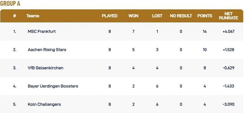 Following are the team standings in the two groups after the eighth day of matches in the Krefeld T10 League 2021: