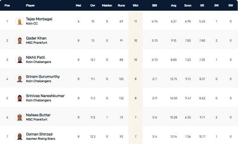 The Bayer Uerdingen Wolves quartet of Taha Hassan (6), Raj Bhushan (5), Abdul Haseeb (4) and Hammad Ashraf (4), the Dusseldorf Blackcaps trio of Kashif Shahab (6), Abdulmajeed Ahmadzai (6) and Venkat Ganesan (4), the Bonn Blue Star duo of Haron Khan (5) and Vikram Jeet (3), and DJK SG Solingen's Venkatesh Reddy (2) are the most successful bowlers of their respective teams.