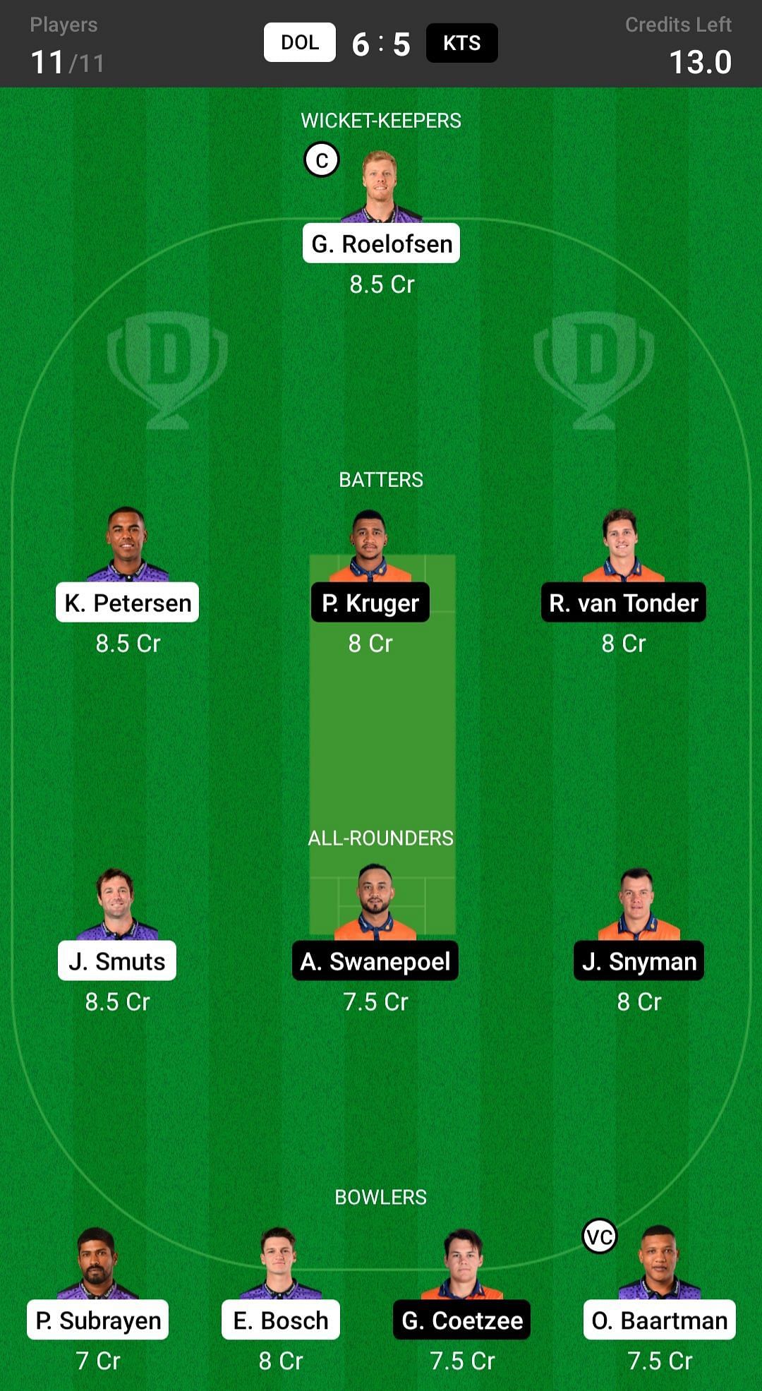 K Petersen and R Van Tonder are the two best batter picks for the Dream11 team. P Kruger has played exceptionally well in the last few matches, so he is also a good pick for today's Dream11 team.