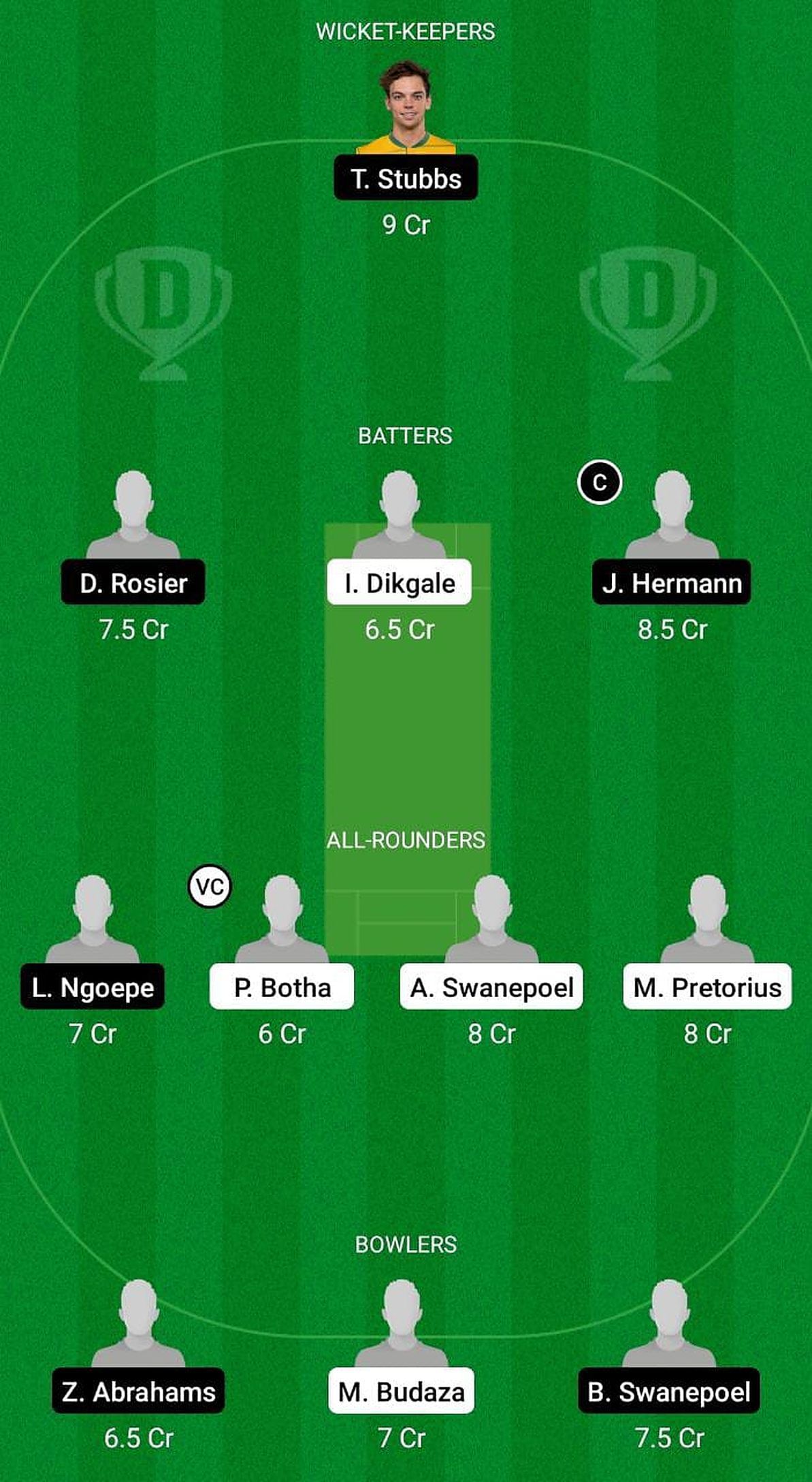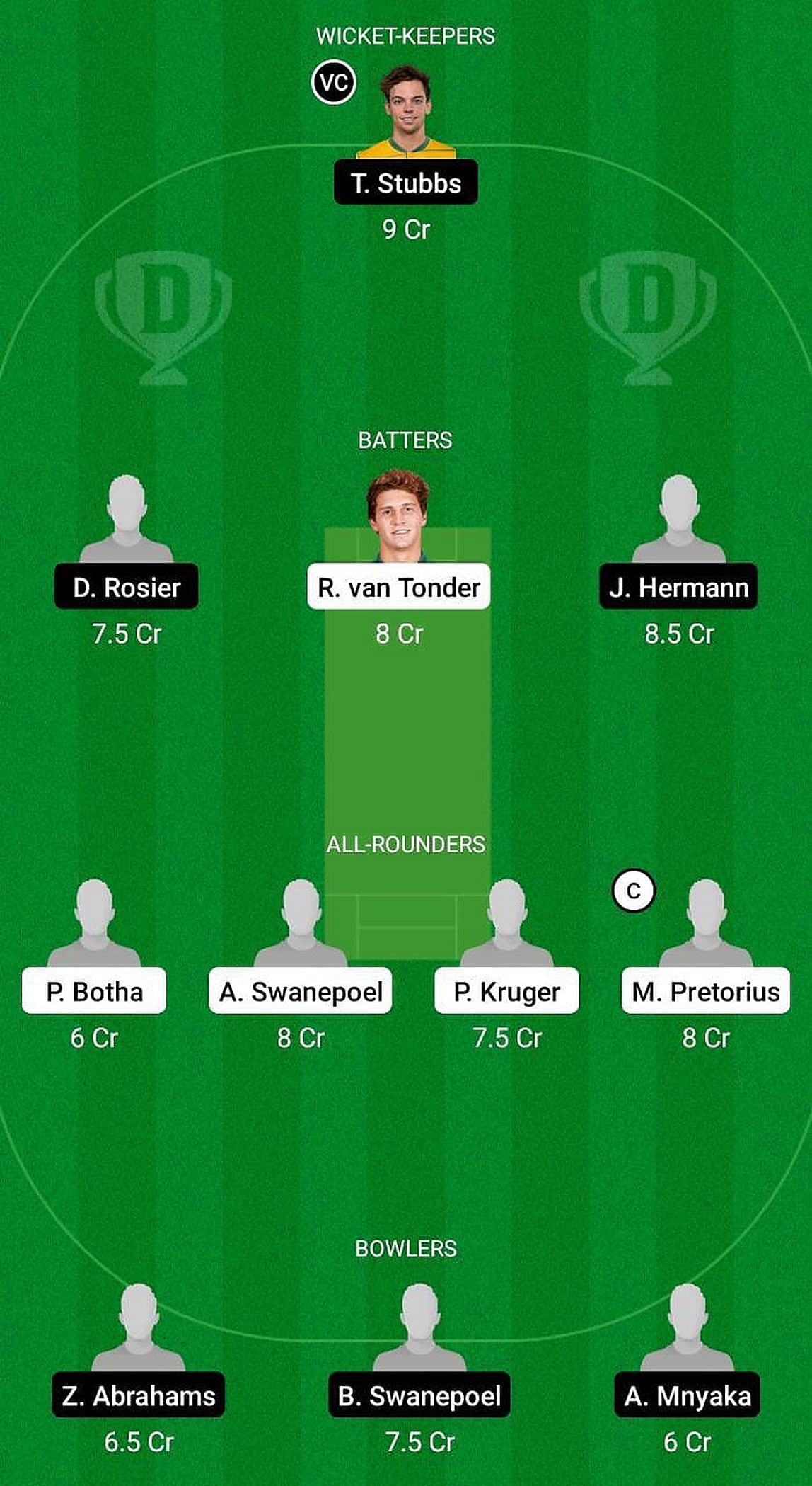 Gihahn Cloete (wk), Jacques Snyman, Isaac Dikgale, Raynard van Tonder, Patrick Botha, Patrick Kruger, Aubrey Swanepoel (c), Migael Pretorius, Nhlakanipho Mpungose, Mbulelo Budaza, Garnett Tarr