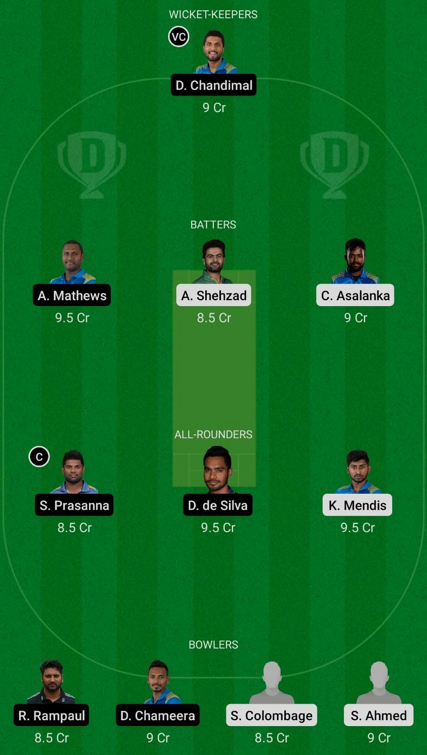 Fantasy Suggestion #1: D Chandimal, C Asalanka, A Shehzad, A Mathews, S Prasanna, K Mendis, D De Silva, D Chameera, S Colombage, S Ahmed, R Rampaul