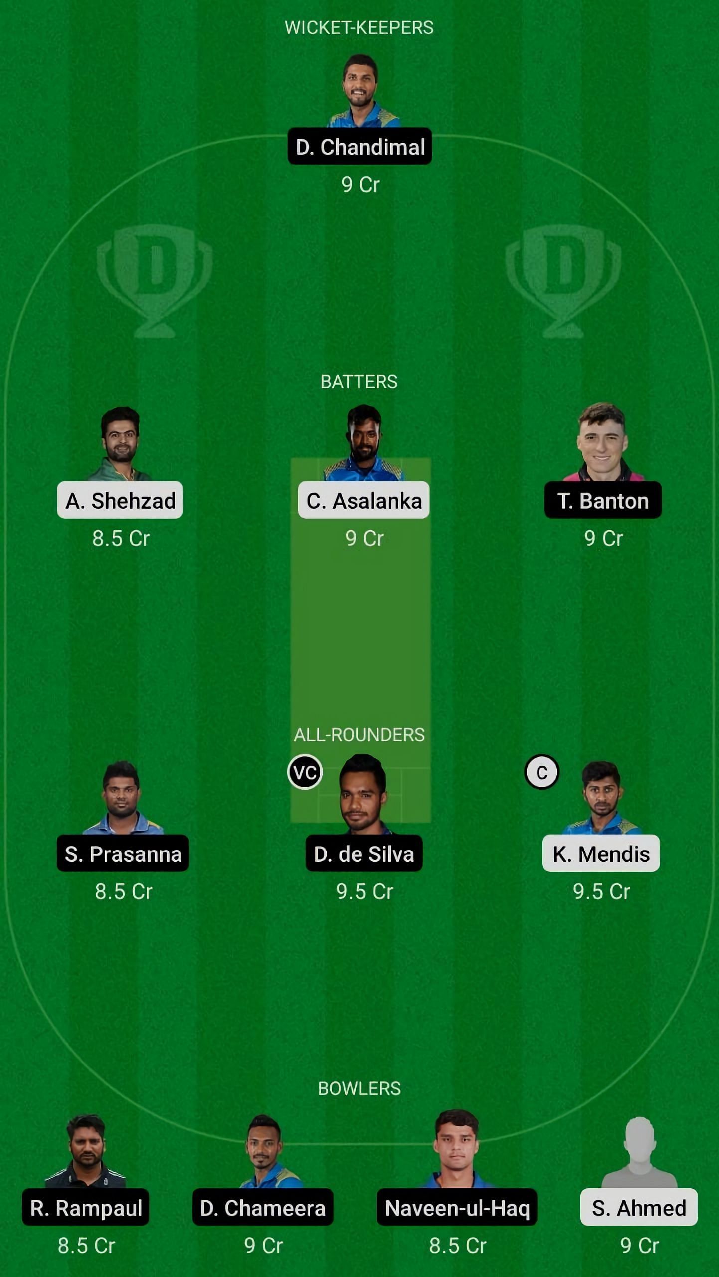 Fantasy Suggestion #2: D Chandimal, C Asalanka, A Shehzad, T Banton, S Prasanna, K Mendis, D De Silva, D Chameera, N ul Haq, S Ahmed, R Rampaul