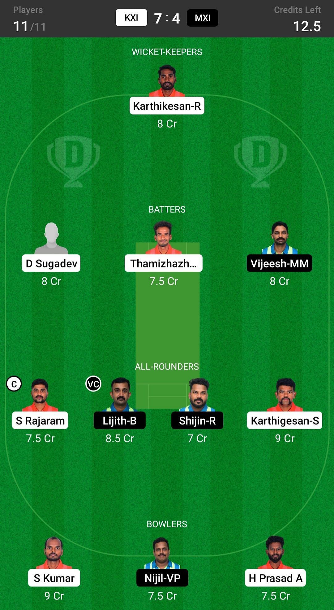 Vijeesh M and D Sugadev are the two best batter picks for the Dream11 team. Thamizhazhagan R is another good pick for today's Dream11 team. He has performed exceptionally well in the last few matches.