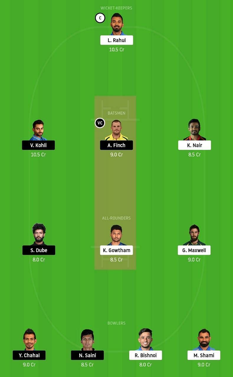 Fantasy Suggestion #1: KL Rahul, Virat Kohli, Aaron Finch, Karun Nair, Shivam Dube, Krishnappa Gowtham, Glenn Maxwell, Mohammed Shami, Yuzvendra Chahal, Navdeep Saini and Ravi Bishnoi