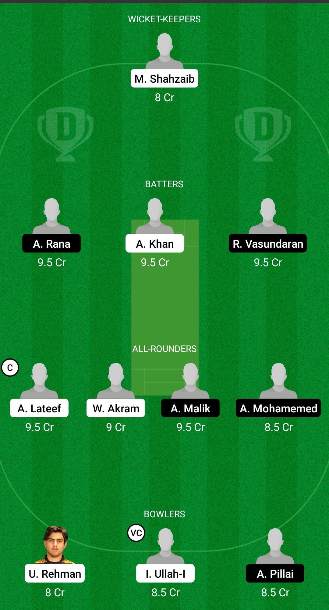 Fantasy Suggestion #1: Muhammad Shahzaib, Adeel Rana, Amjad Khan, Rajesh Vasundaran, Abdul Lateef, Wasim Akram, Ashraf Malik, Arshad Mohamemed, Unaib Rehman, Irfan Ullah, Anil Pillai.