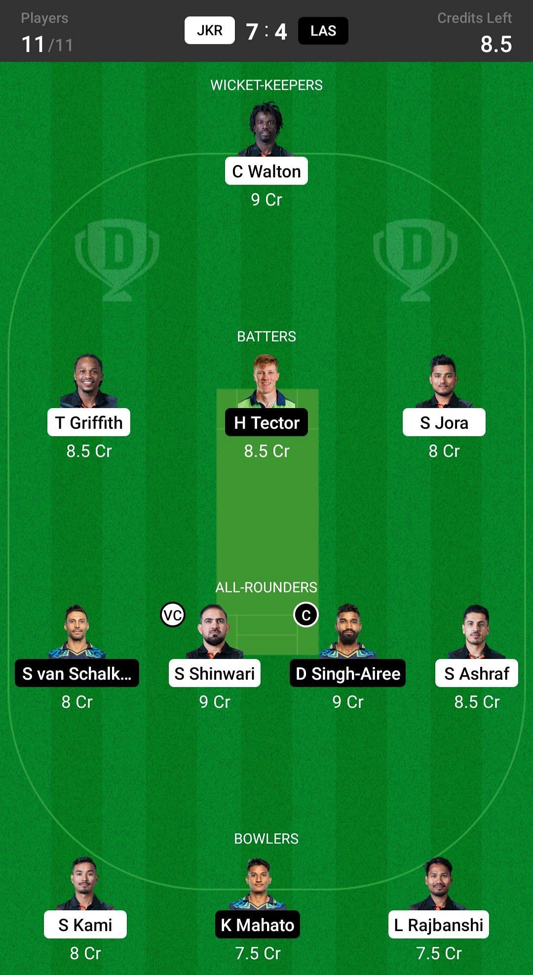 S Jora and H Tector are the two best batsmen picks for the Dream11 team. T Griffith has played exceptionally well in the last match, so he is also a good pick for today's Dream11 team.