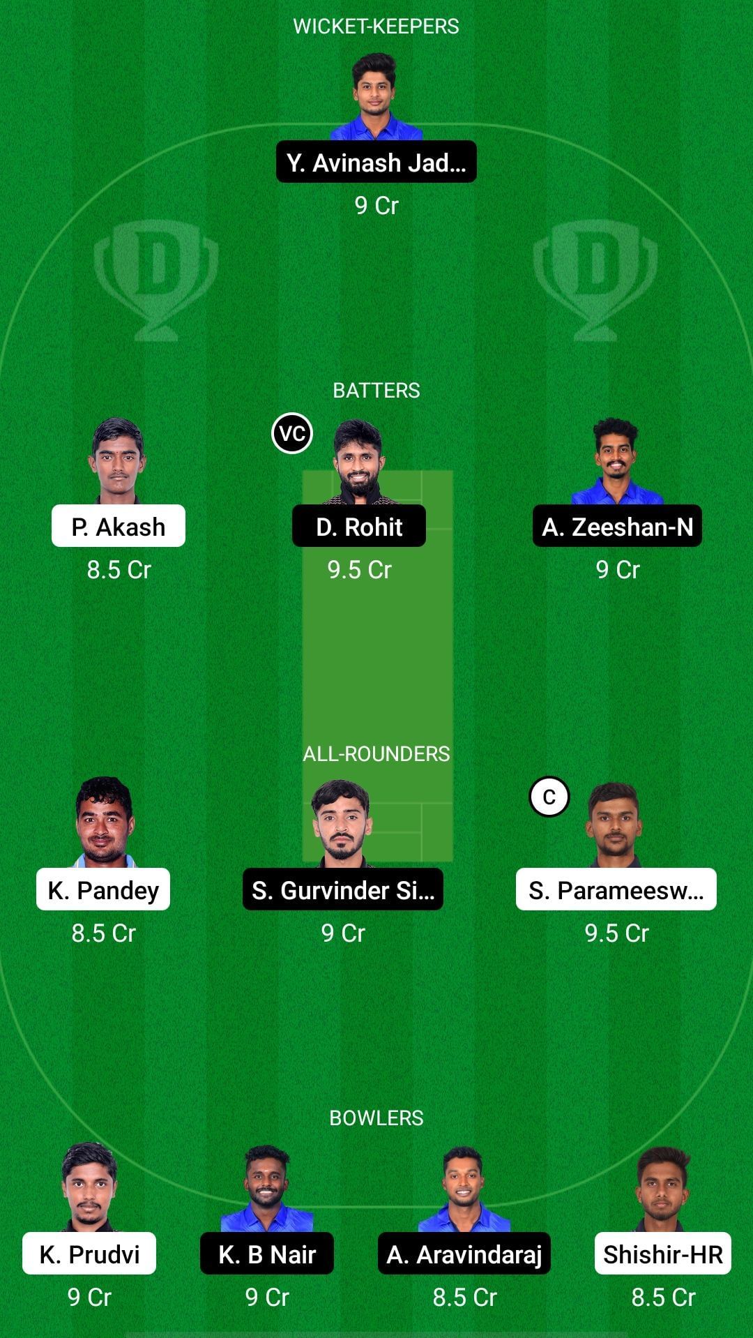 Fantasy Suggestion #1: Yash Avinash Jadhav, P Akash, Damodaran Rohit, Ameer Zeeshan N, Krishna Pandey, Sidak Gurvinder Singh, S Parameeswaran, Karthik B Nair, Shishir HR, Aravindaraj A, Kashyap Prudvi.