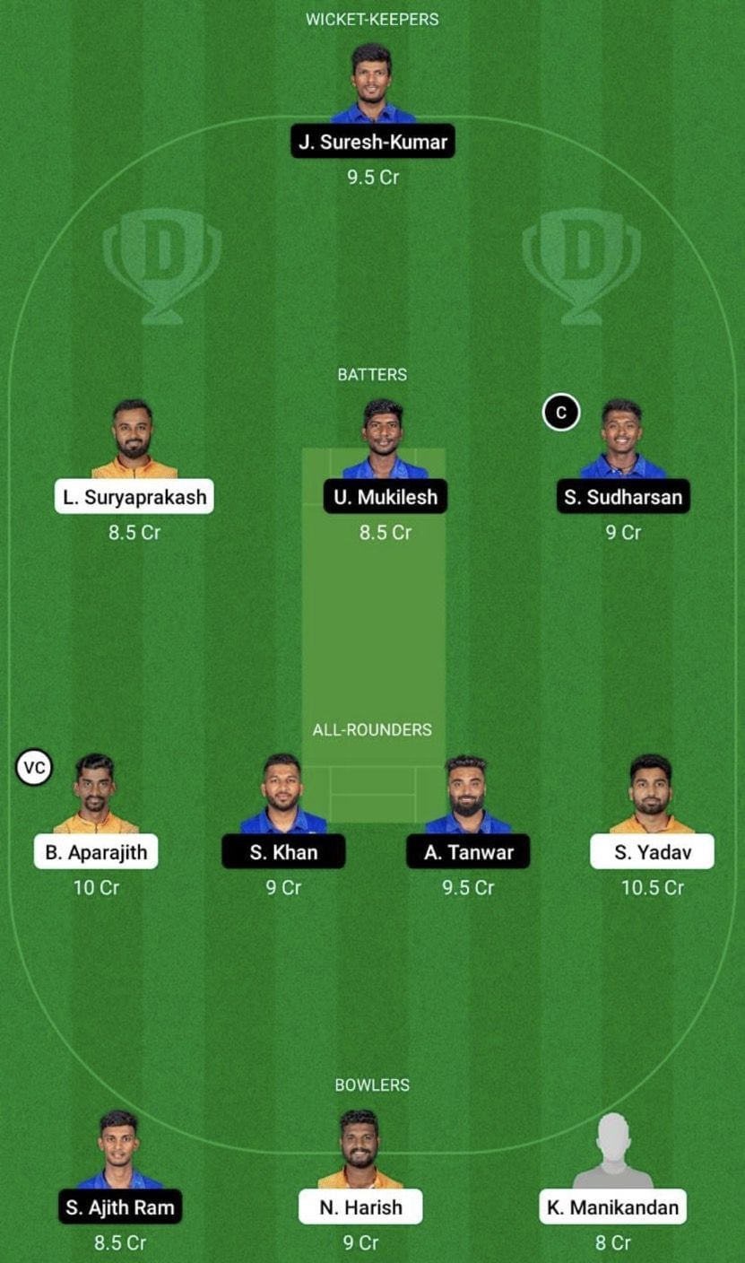 Fantasy Suggestion #2: J Suresh Kumar, L Suryaprakash, U Mukilesh, S Sudharsan, B Aparajith, S Khan, A Tanwar, S Yadav, NS Harish, S Ajith Ram and K Manikandan.