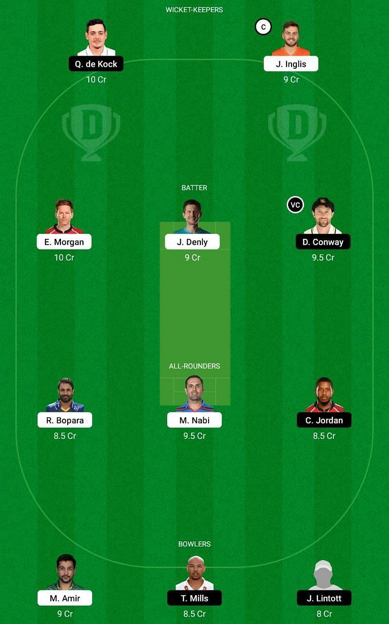 Fantasy Suggestion #1: Quinton de Kock, Josh Inglis, Eoin Morgan, Joe Denly, Devon Conway, Ravi Bopara, Mohammad Nabi, Chris Jordan, Mohammad Amir, Tymal Mills and Jake Lintott