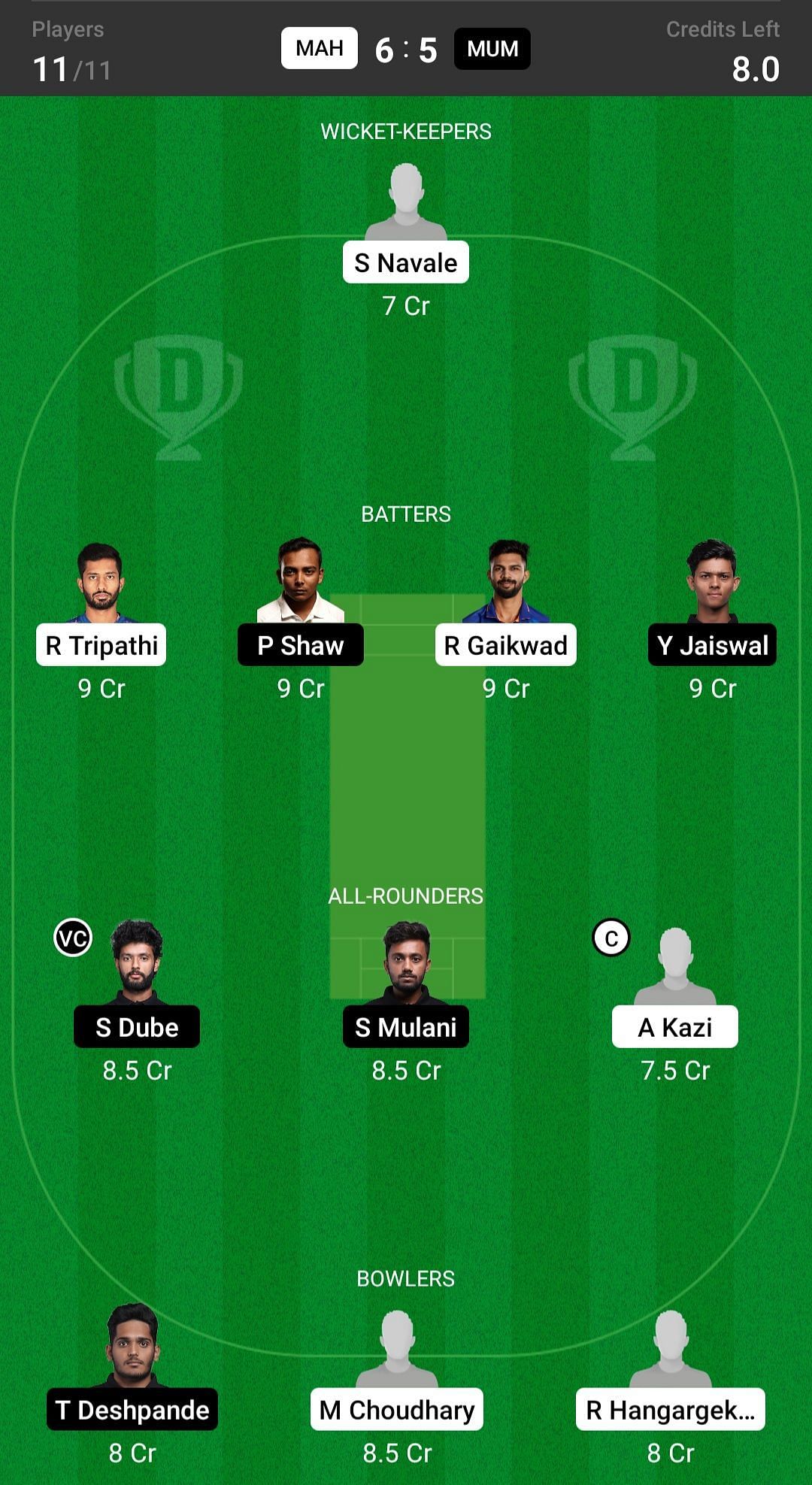 S Dube and A Kazi are the best all-rounder picks for the Dream11 team as they are batting in the top order and also completing their quota of ten overs. S Mulani is another good pick for today's Dream11 team.