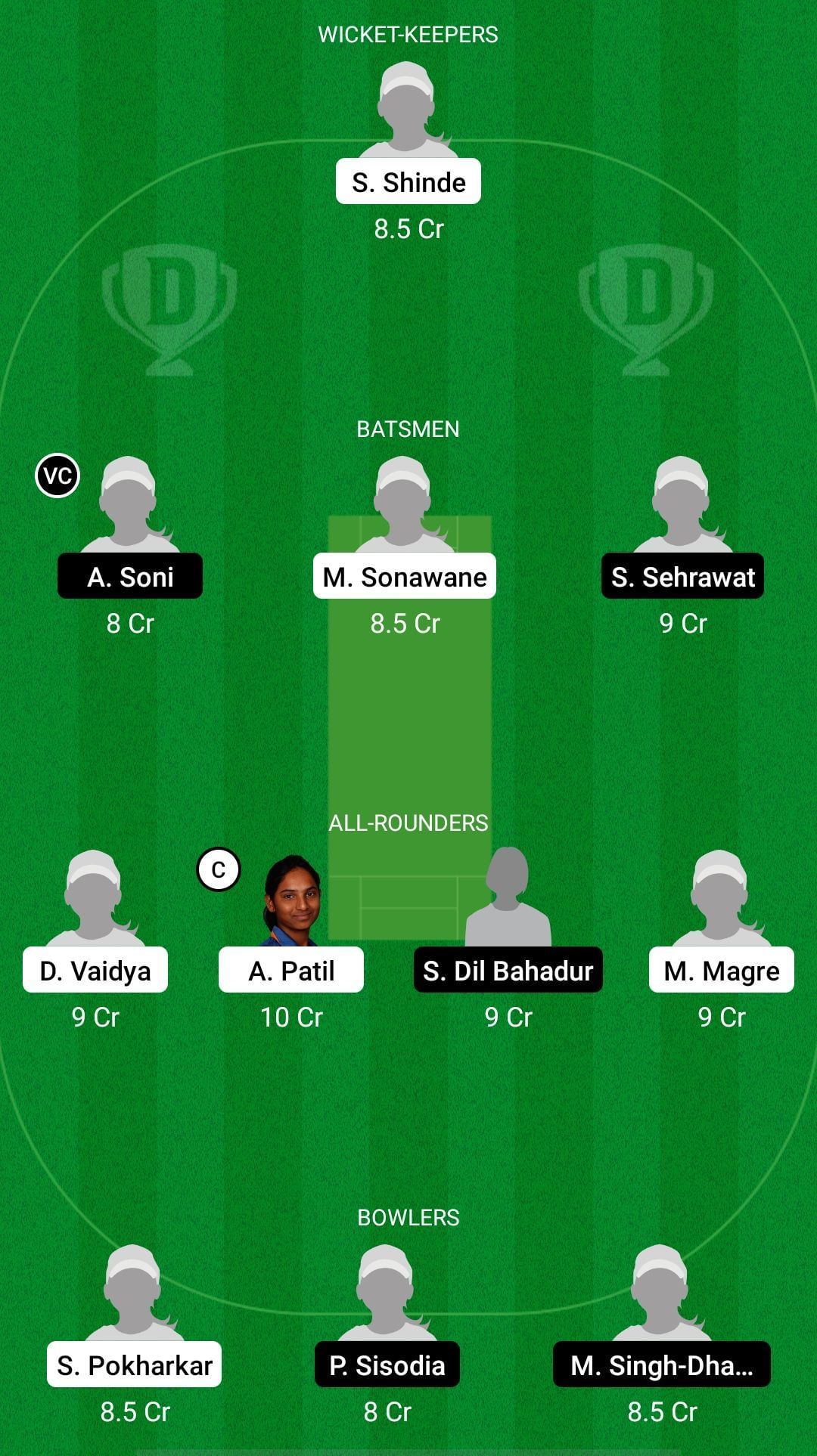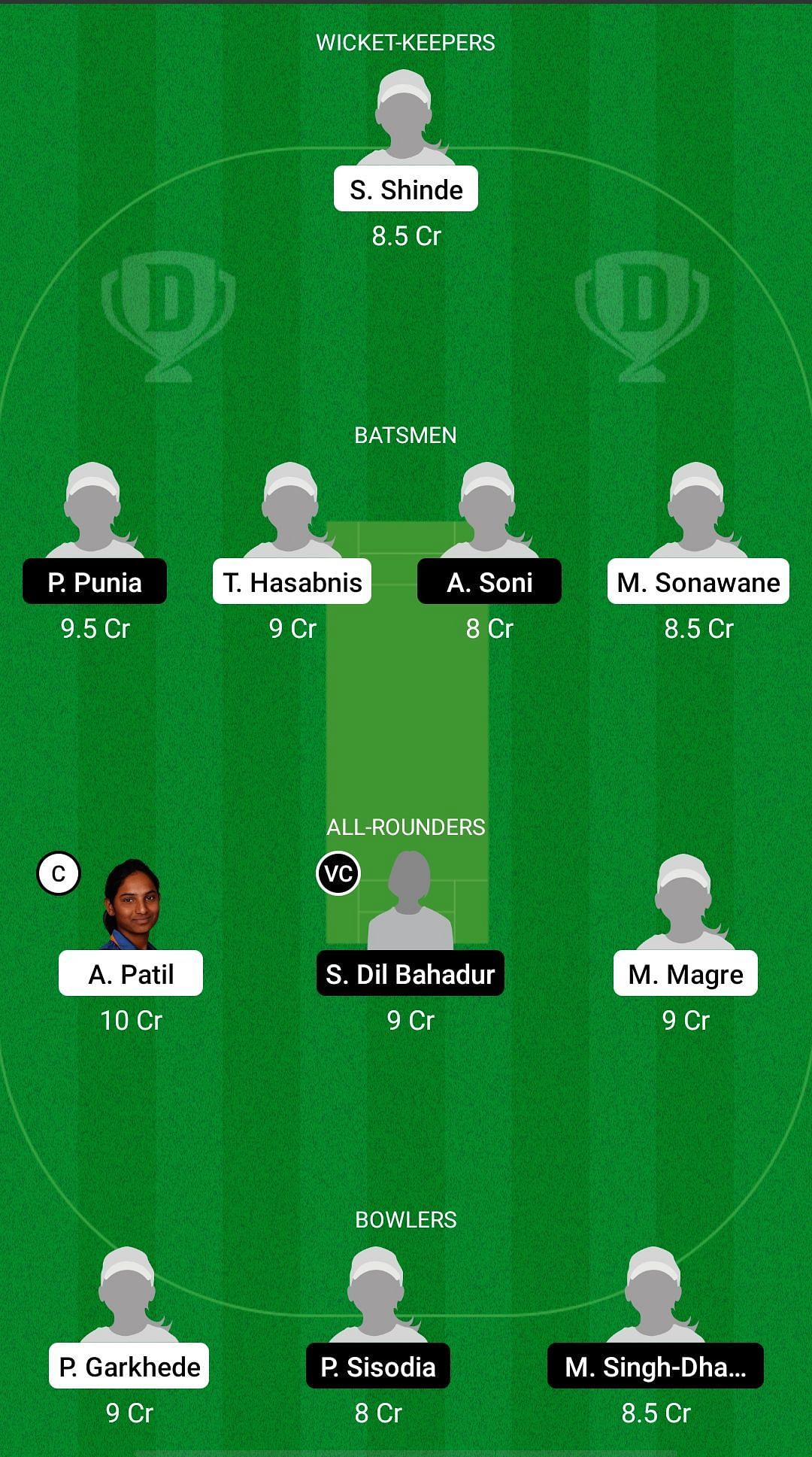 Fantasy Suggestion #1: Shivali Shinde, Priya Punia, Tejal Hasabnis, Ayushi Soni, Maya Sonawane, Anuja Patil, Simran Dil Bahadur, Mukta Magre, Priyanka Garkhede, Parunika Sisodia, Madhu Singh-Dhama.