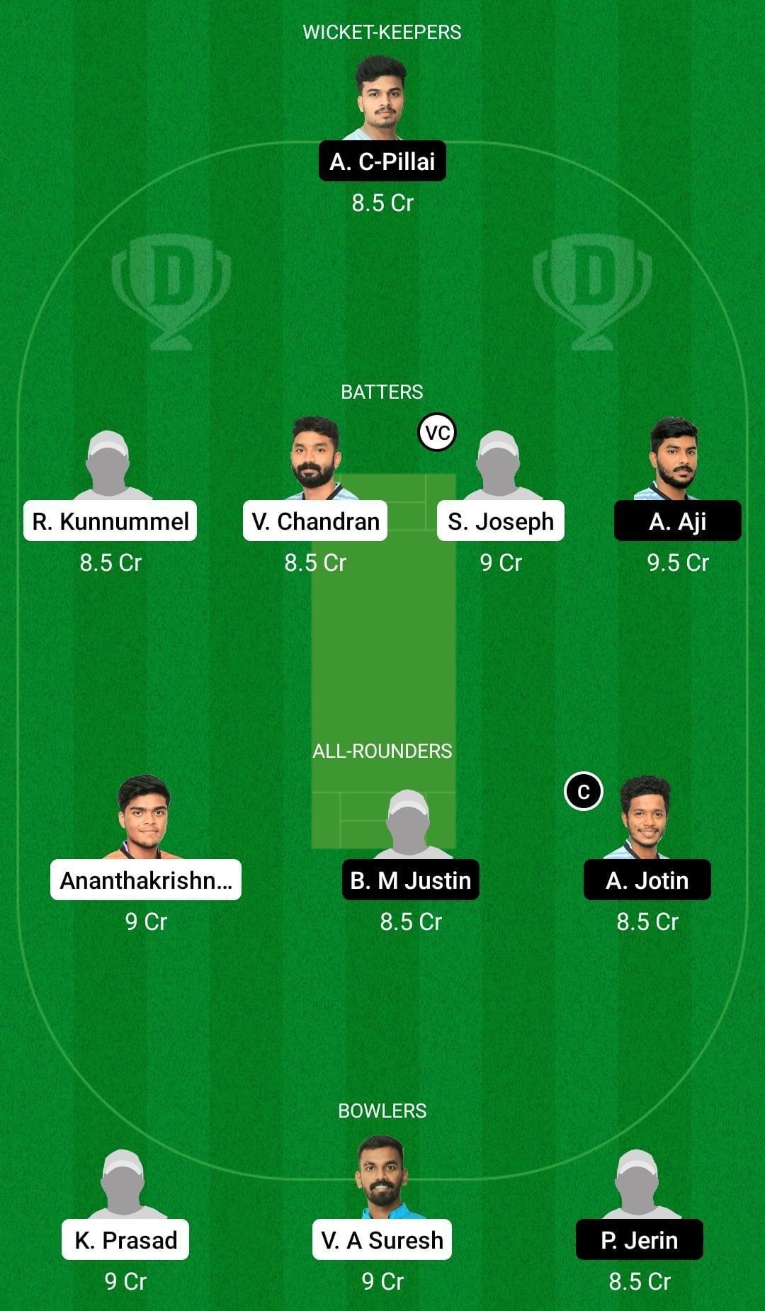 Fantasy Suggestion #1: Akash C Pillai, Rohan Kunnummal, Vaisakh Chandran, Sijomon Joseph, Arjun Aji, Ananthakrishanan J, Bovas M Justin, Anuj Jotin, Krishna Prasad, Vishweshwar A Suresh, Jerin PS.