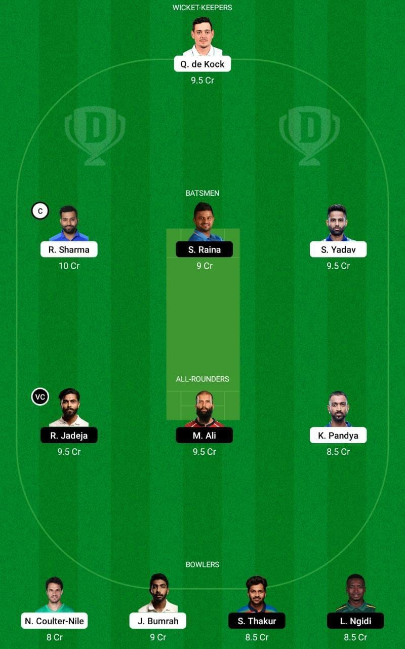 Fantasy Suggestion #1: Quinton de Kock, Rohit Sharma, Suryakumar Yadav, Suresh Raina, Ravindra Jadeja, Moeen Ali, Krunal Pandya, Jasprit Bumrah, Lungi Ngidi, Shardul Thakur and Nathan Coulter-Nile