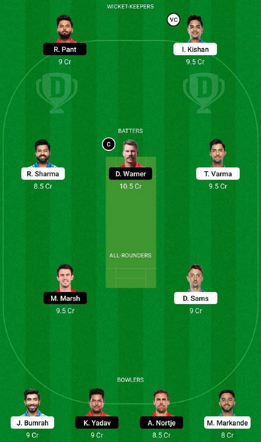 Fantasy Suggestion #2: Rishabh Pant, Ishan Kishan, Tilak Varma, Rohit Sharma, David Warner, Mitchell Marsh, Daniel Sams, Jasprit Bumrah, Mayank Markande, Kuldeep Yadav and Anrich Nortje.