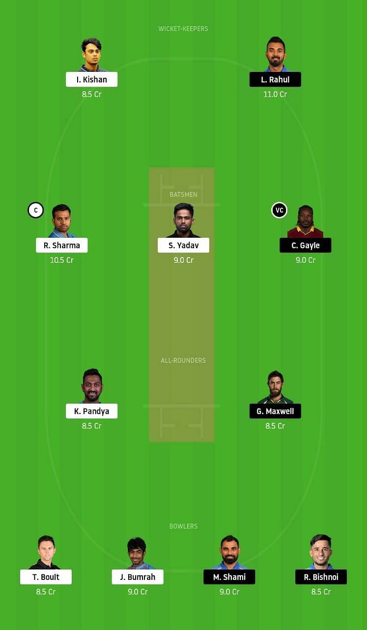 Fantasy Suggestion #1: KL Rahul, Ishan Kishan, Rohit Sharma, Suryakumar Yadav, Chris Gayle, Krunal Pandya, Glenn Maxwell, Mohammed Shami, Trent Boult, Jasprit Bumrah and Ravi Bishnoi