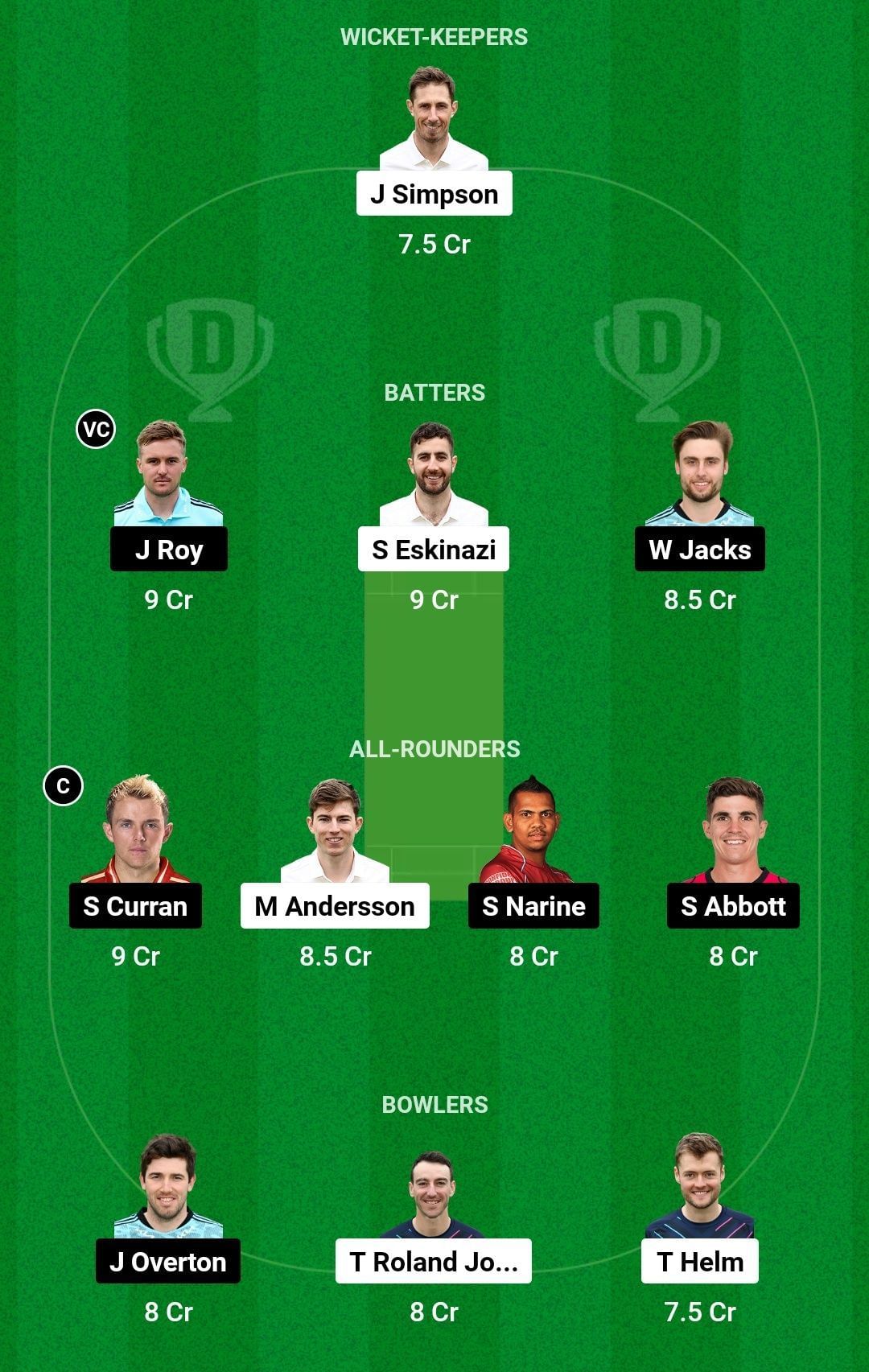 Surrey Probable Playing XI: Will Jacks, Jason Roy, Jamie Smith (wk), Laurie Evans, Sam Curran (c), Sunil Narine, Jamie Overton, Cameron Steel, Sean Abbott, Tom Curran, and Gus Atkinson.