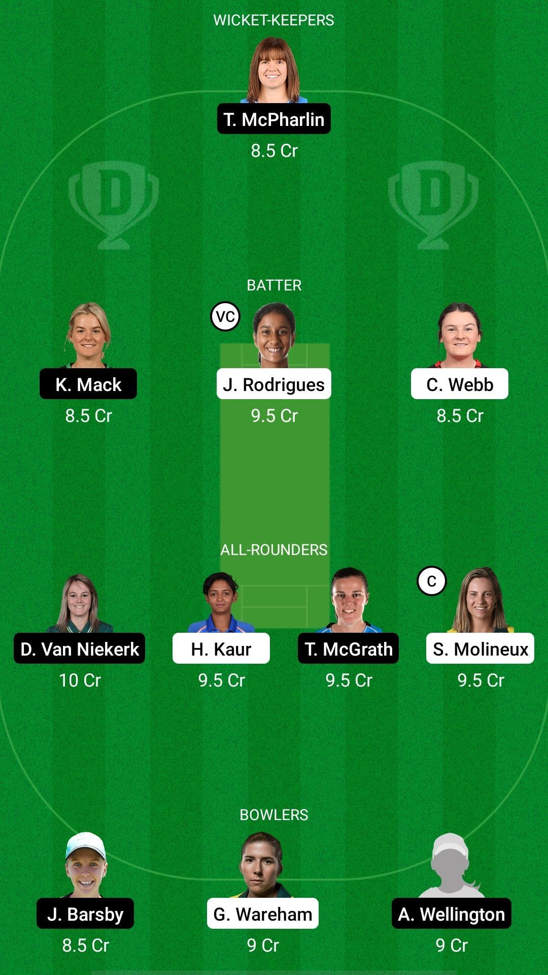 Fantasy Suggestion #2: Tegan McPharlin, Katie Mack, Jemimah Rodrigues, Courtney Webb, Dane Van Niekerk, Harmanpreet Kaur, Tahlia McGrath, Sophie Molineux, Jemma Barsby, Georgia Wareham, Amanda Jade Wellington.