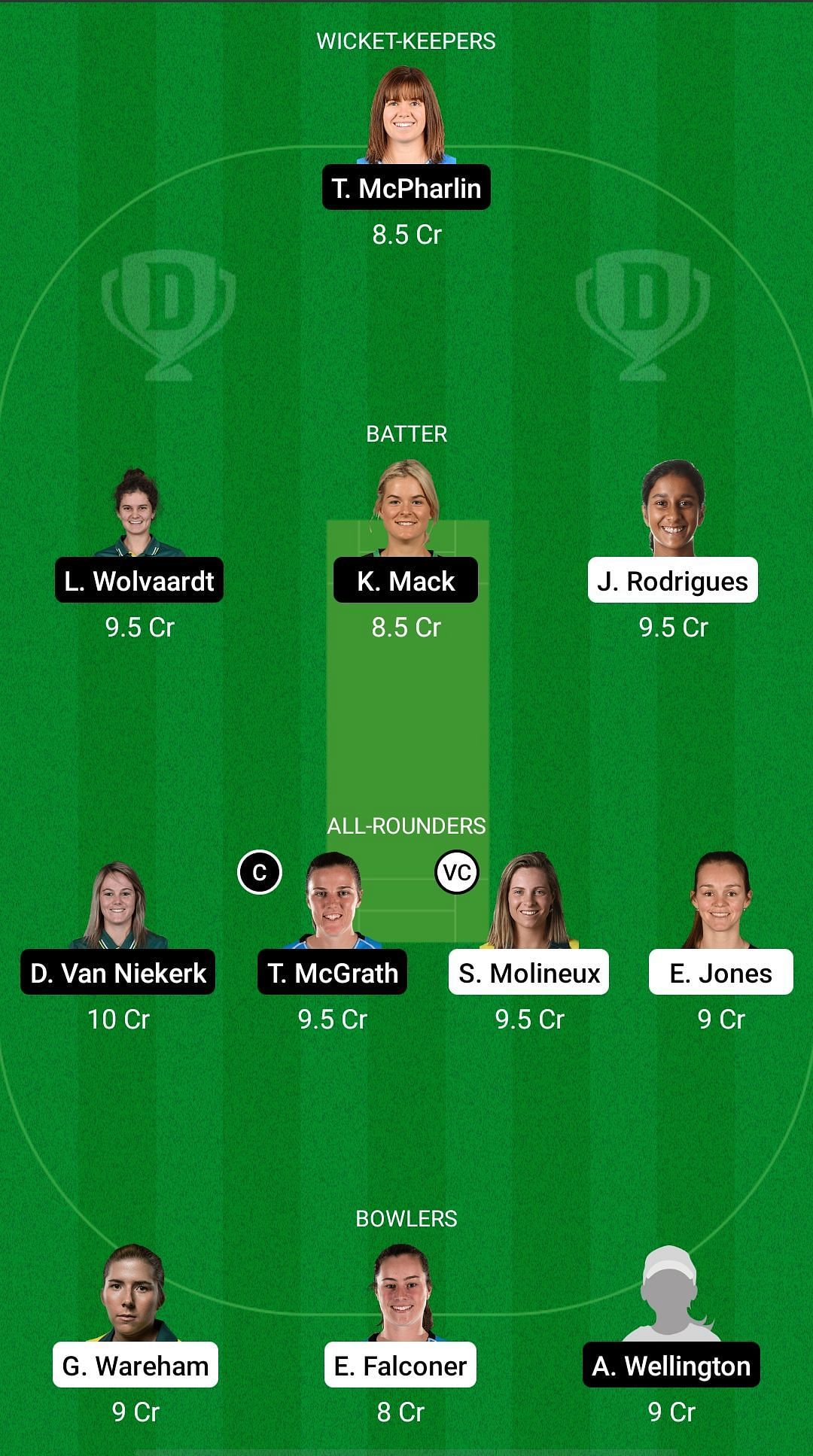 Fantasy Suggestion #1: Tegan McPharlin, Laura Wolvaardt, Katie Mack, Jemimah Rodrigues, Dane Van Niekerk, Tahlia McGrath, Sophie Molineux, Evelyn Jones, Georgia Wareham, Ellie Falconer, Amanda Jade Wellington.