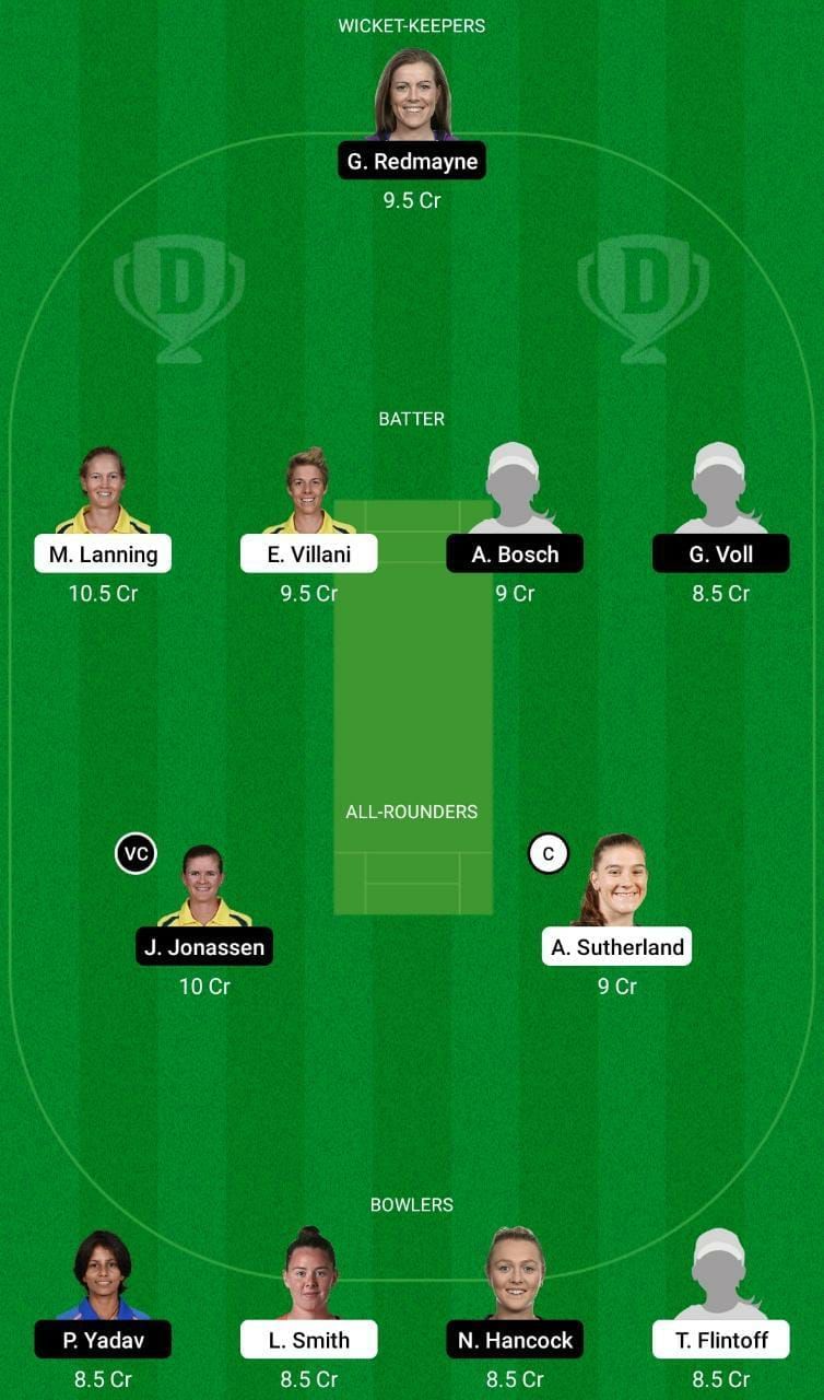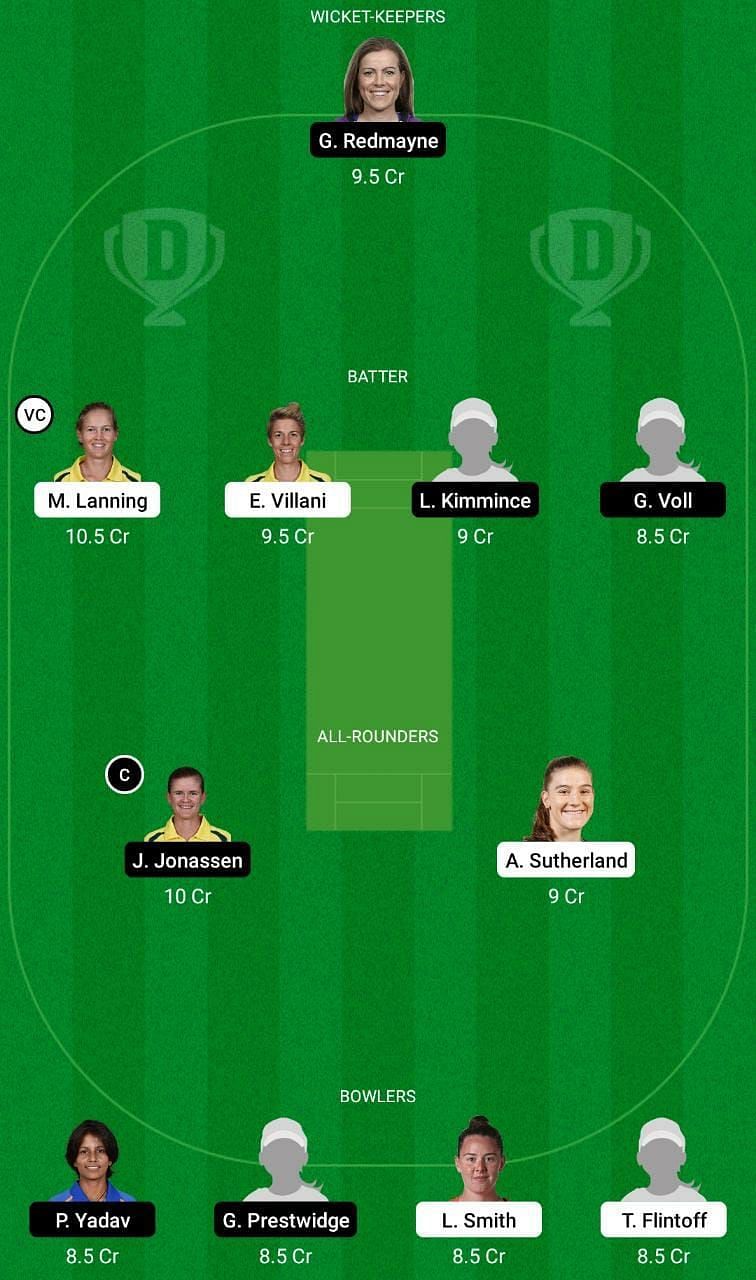 Fantasy Suggestion #2: Georgia Redmayne, Ellyse Villani, Meg Lanning, Georgia Voll, Laura Kimmince, Annabel Sutherland, Jess Jonassen, Georgia Redmayne, Poonam Yadav, Tess Flintoff and Linsey Smith