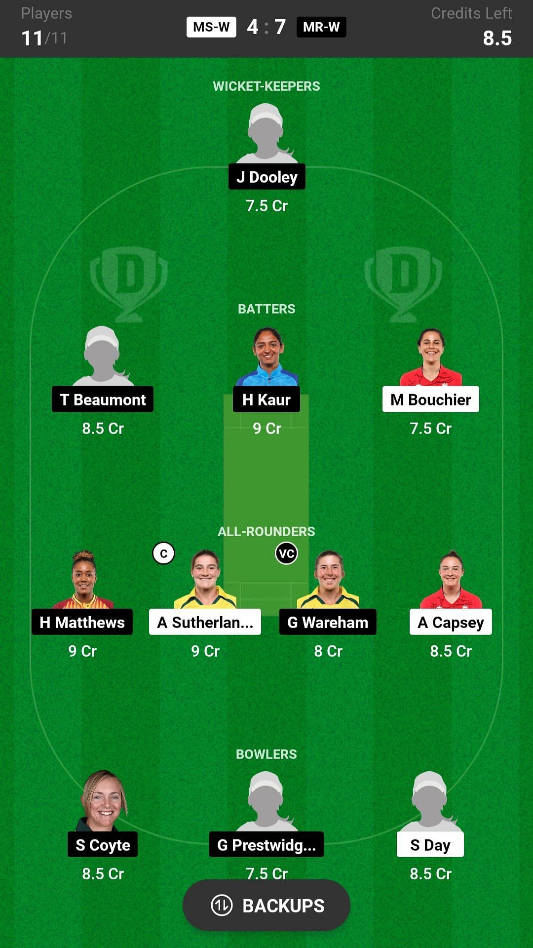 MS-W vs MR-W Dream11 Prediction Today, Grand League