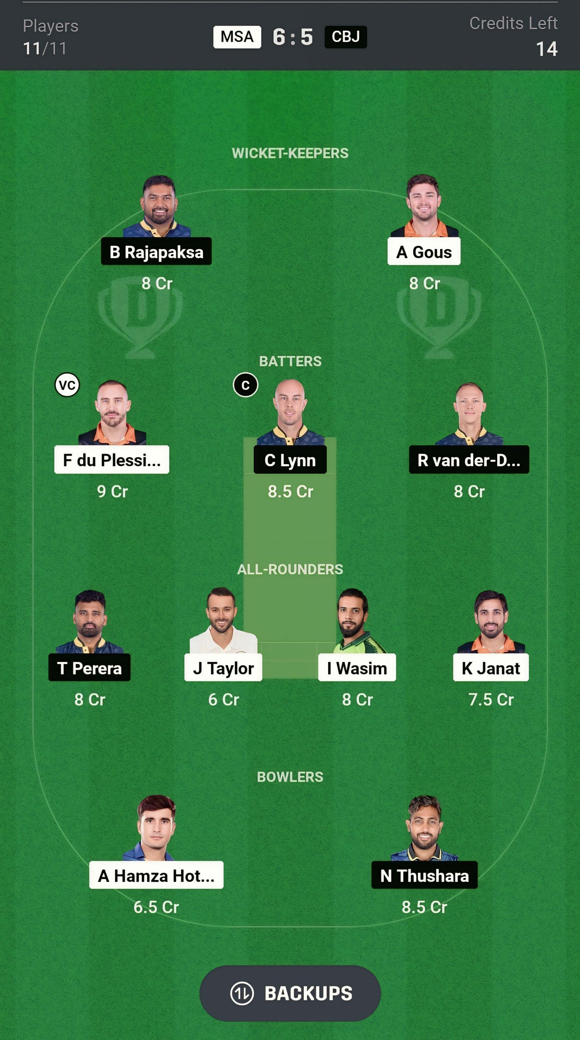 Chris Lynn and Faf du Plessis are the two best batters for today's Dream11 team. Faf has already smashed 104 runs in the last three matches. Rassie van der Dussen is another good batter for today's nail-biting match. He smashed 62 runs in just 29 balls in the first match against Deccan Gladiators.