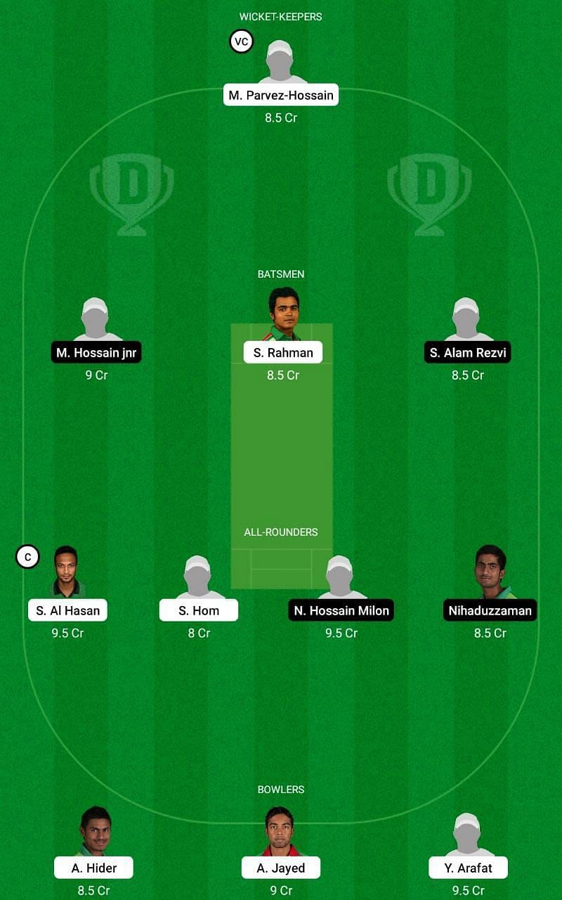 Fantasy Suggestion #1: M Parvez Hossain, M Hossain Jr, S Rahman, S Alam, S Al Hasan, S Hom, N Hossain, Nihaduzzaman, A Hider, A Jayed and Y Arafat