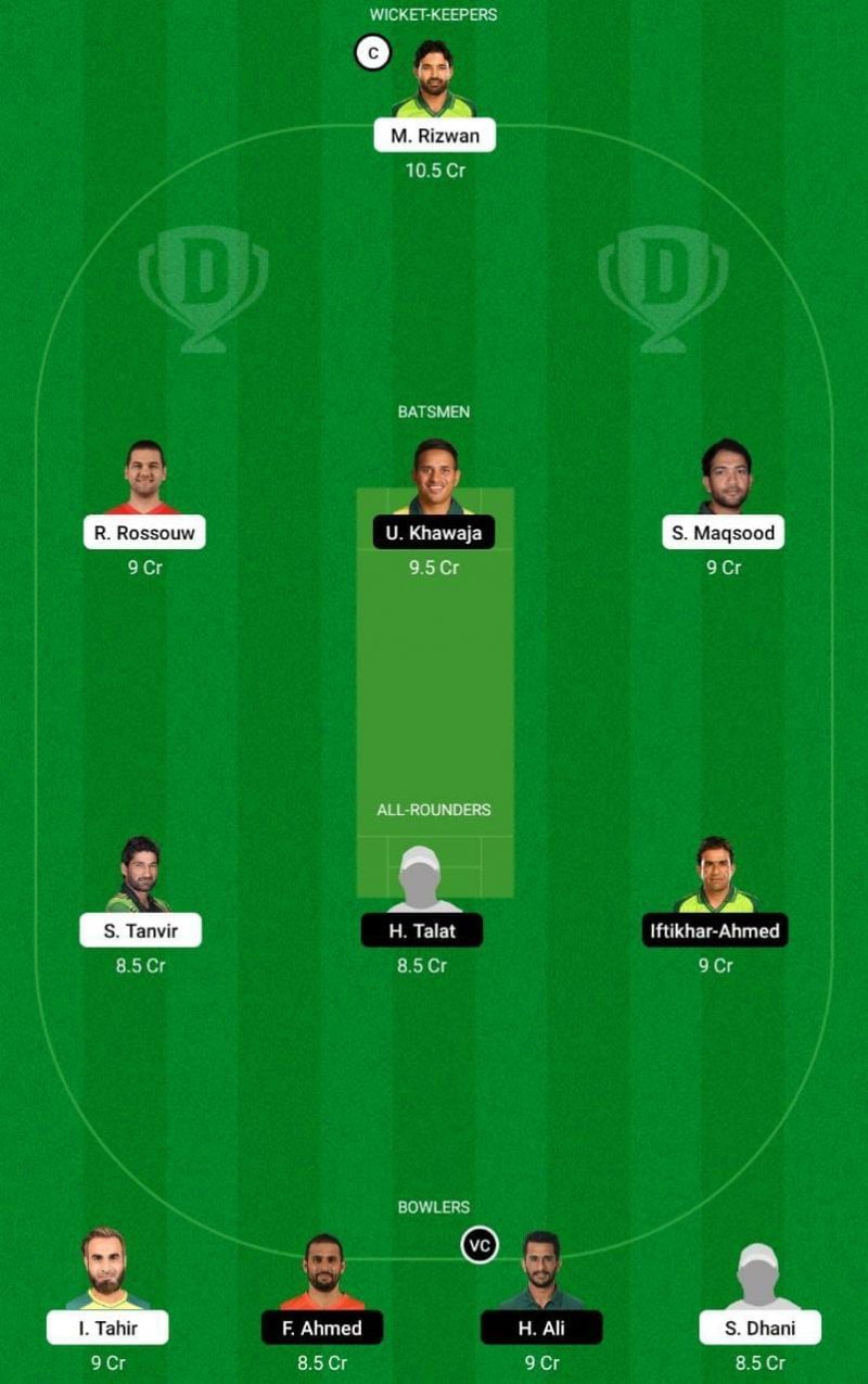 Fantasy Suggestion #1: M Rizwan, S Maqsood, U Khawaja, R Rossouw, I Ahmed, H Talat, S Tanvir, S Dhani, I Tahir, H Ali and F Ahmed