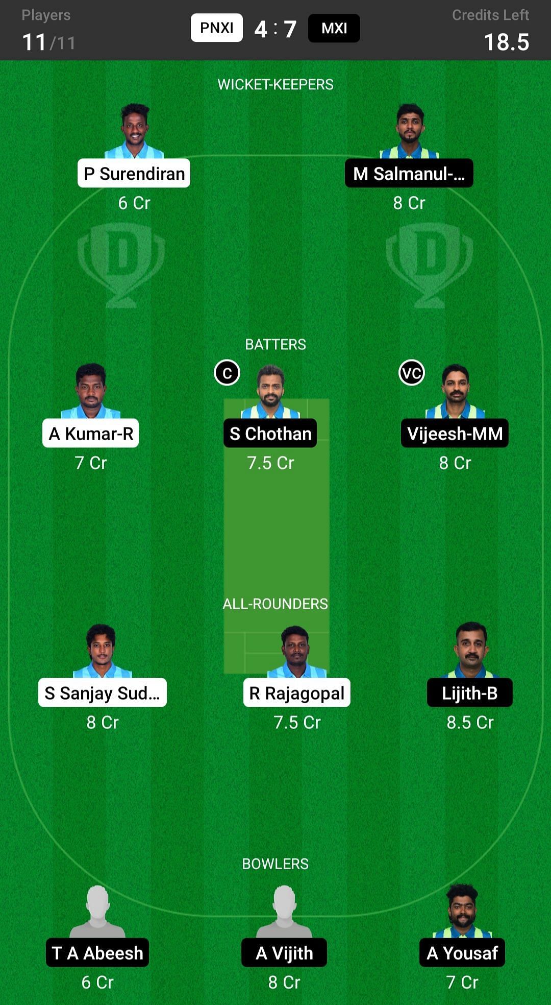 R Rajagopal and Lijith B are the best all-rounder picks for the Dream11 team as they are batting in the top order and also completing their quota of overs. S Sanjay is another good pick for today's match.