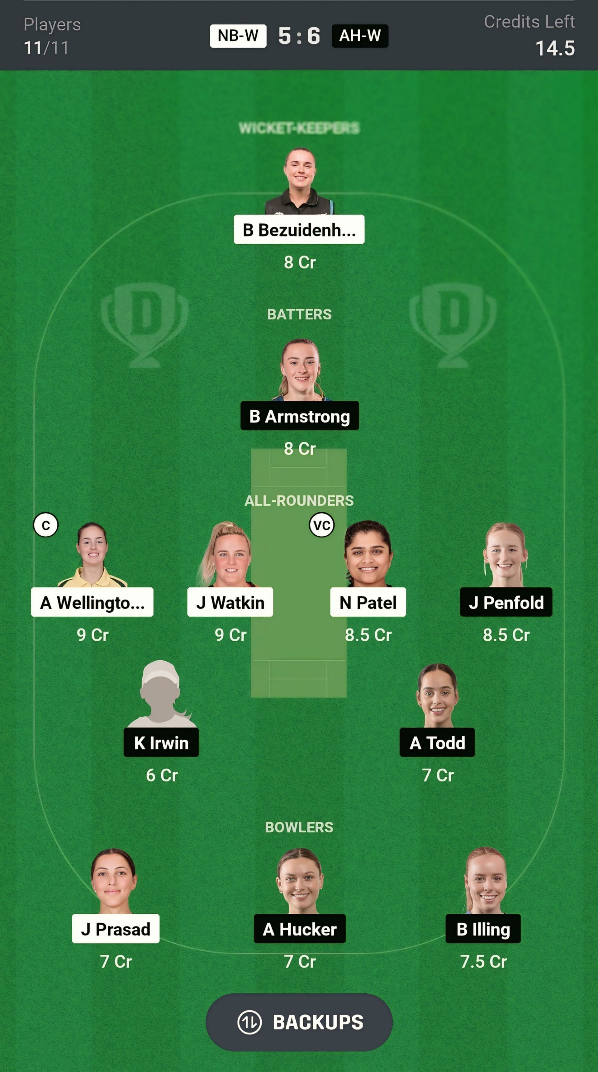 J Watkin and A Wellington are the best all-rounder picks for the Dream11 team. Both will play a crucial role for their teams in today's match. A Wellington will bat in the top order and complete her quota of overs in today's match. N Patel is another good all-rounder for today's match.