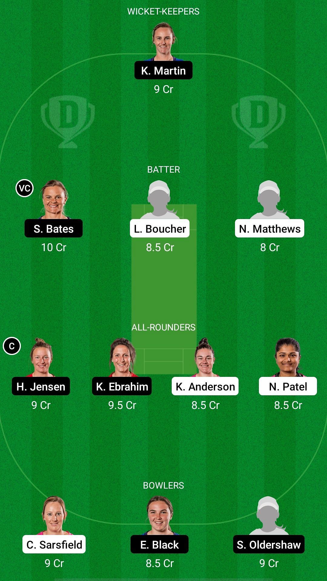 Fantasy Suggestion #1: Katey Martin, Suzie Bates, Lucy Boucher, Naomi Matthews, Hayley Jensen, Kate Ebrahim, Kate Anderson, Nensi Patel, Charlotte Sarsfield, Emma Black, Sophie Oldershaw.